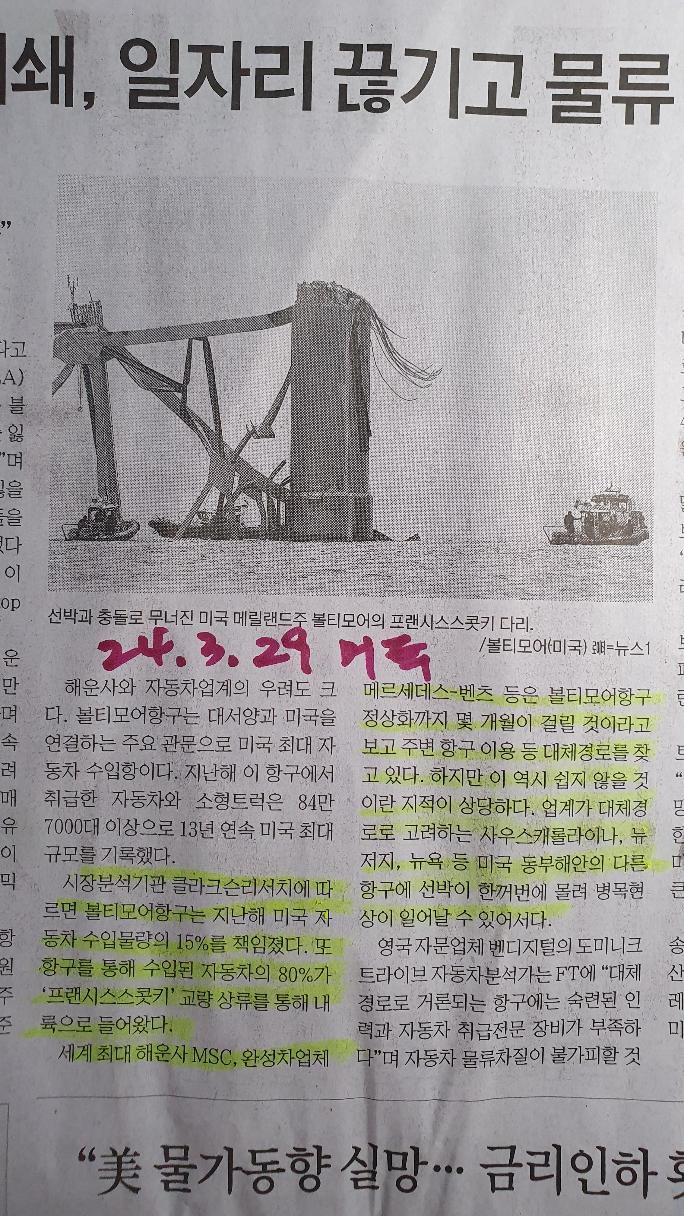 -볼티모어 항구의 배와 교량의 사고로 인한 붕괴로 해상 물류에 큰 영향을 미치고 있다