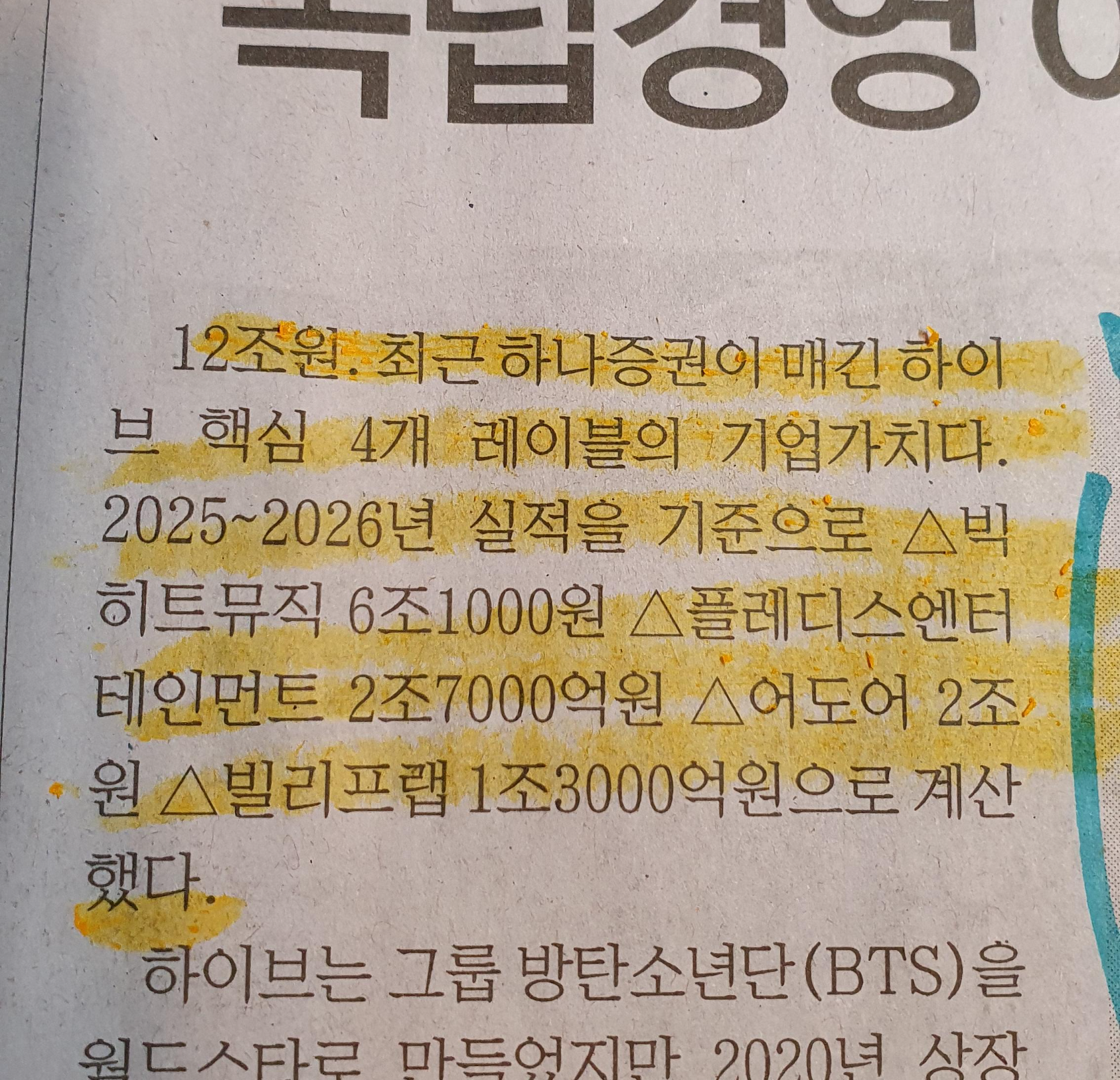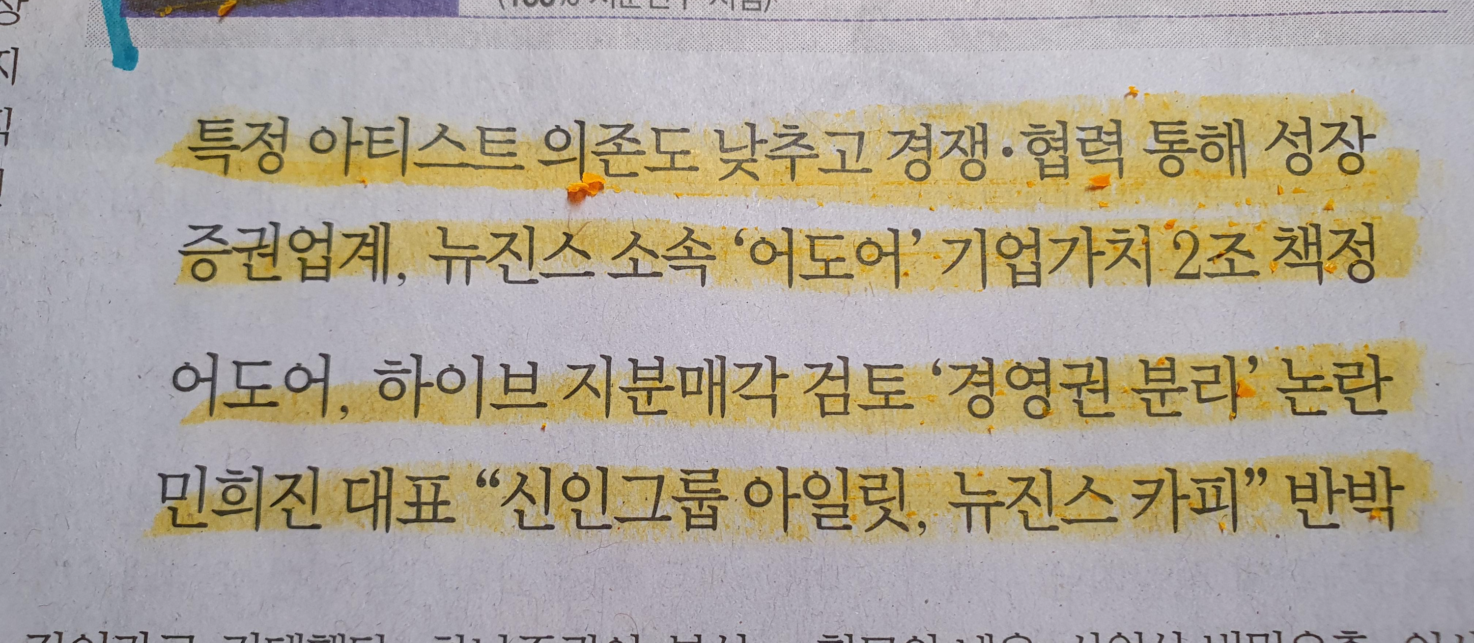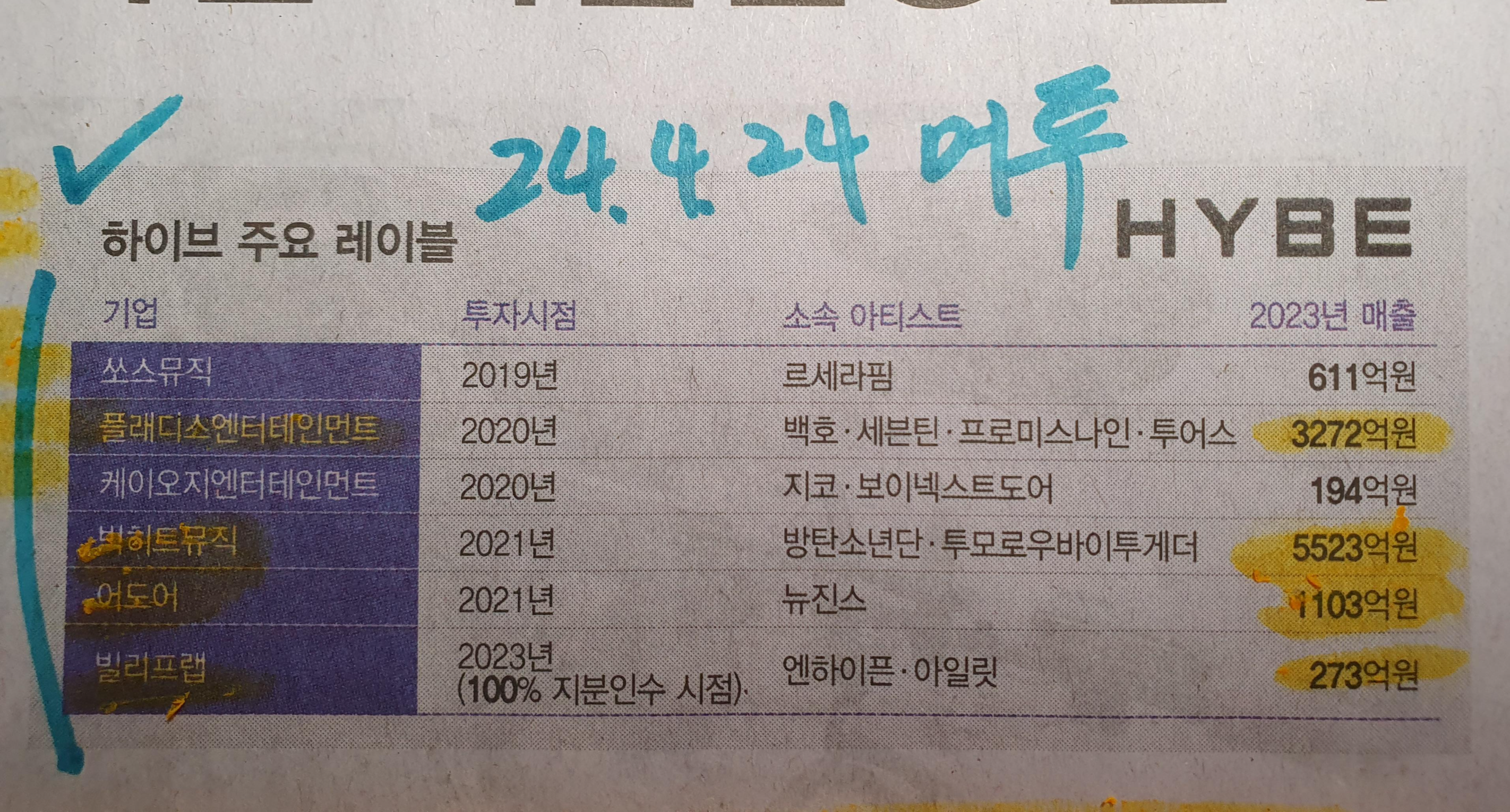 빅히트 5,500억원, 뉴진스의 어도어 1100억 원, 플래디스 3200억 원대