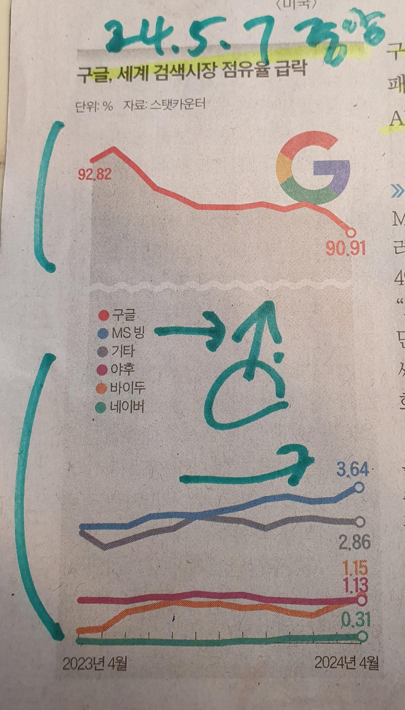 -문제는 기세, AI 검색 GPT라는 시대의 화두에 부응한 MS의 빙은 야금야금 점유율을 높여나고 있더니 이제는 3.64% 대의