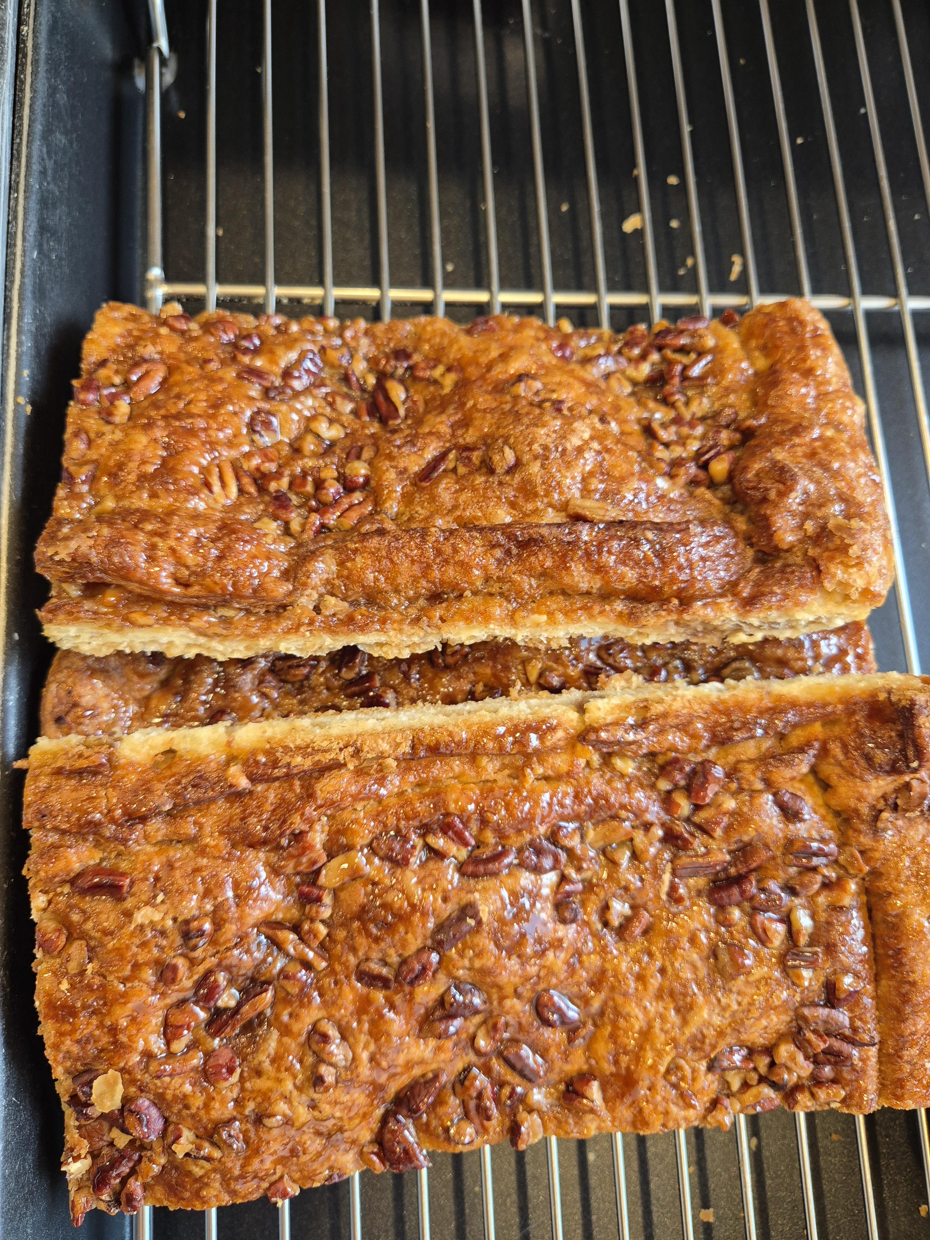 피칸을 뿌리듯이 얹어 구운 모양이 '악어의 등껍질' 같다는 추상적인 이미지가 상상되어