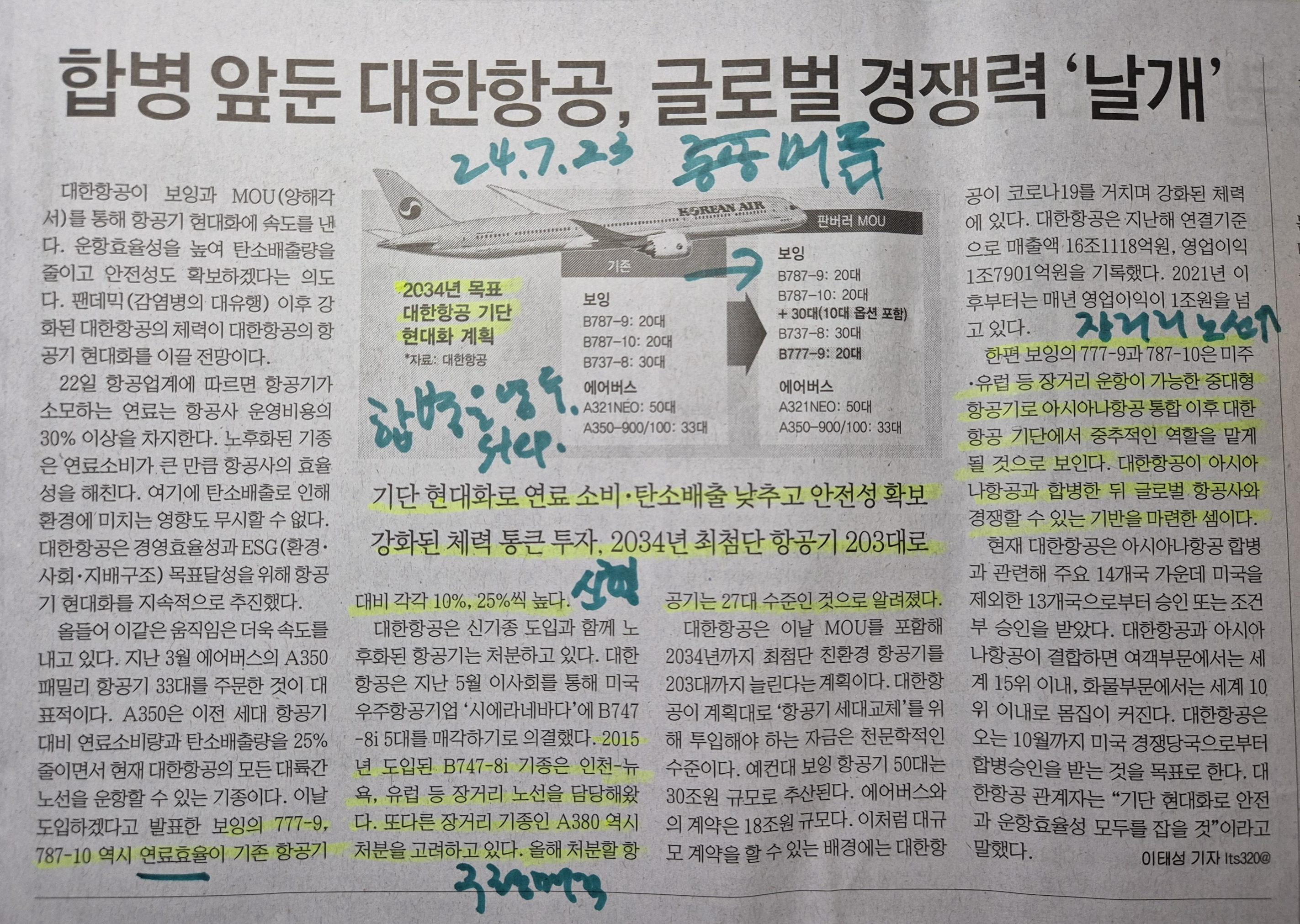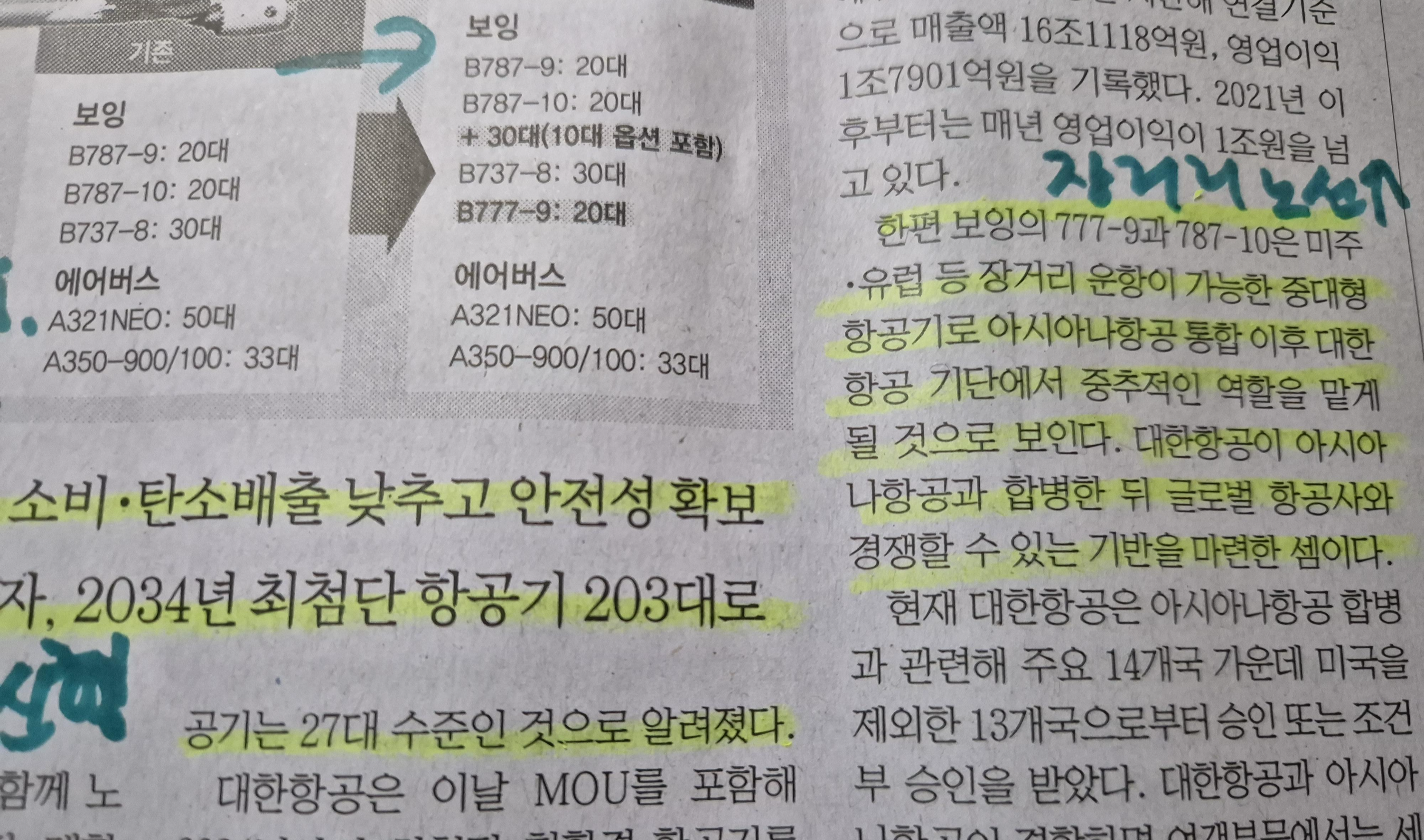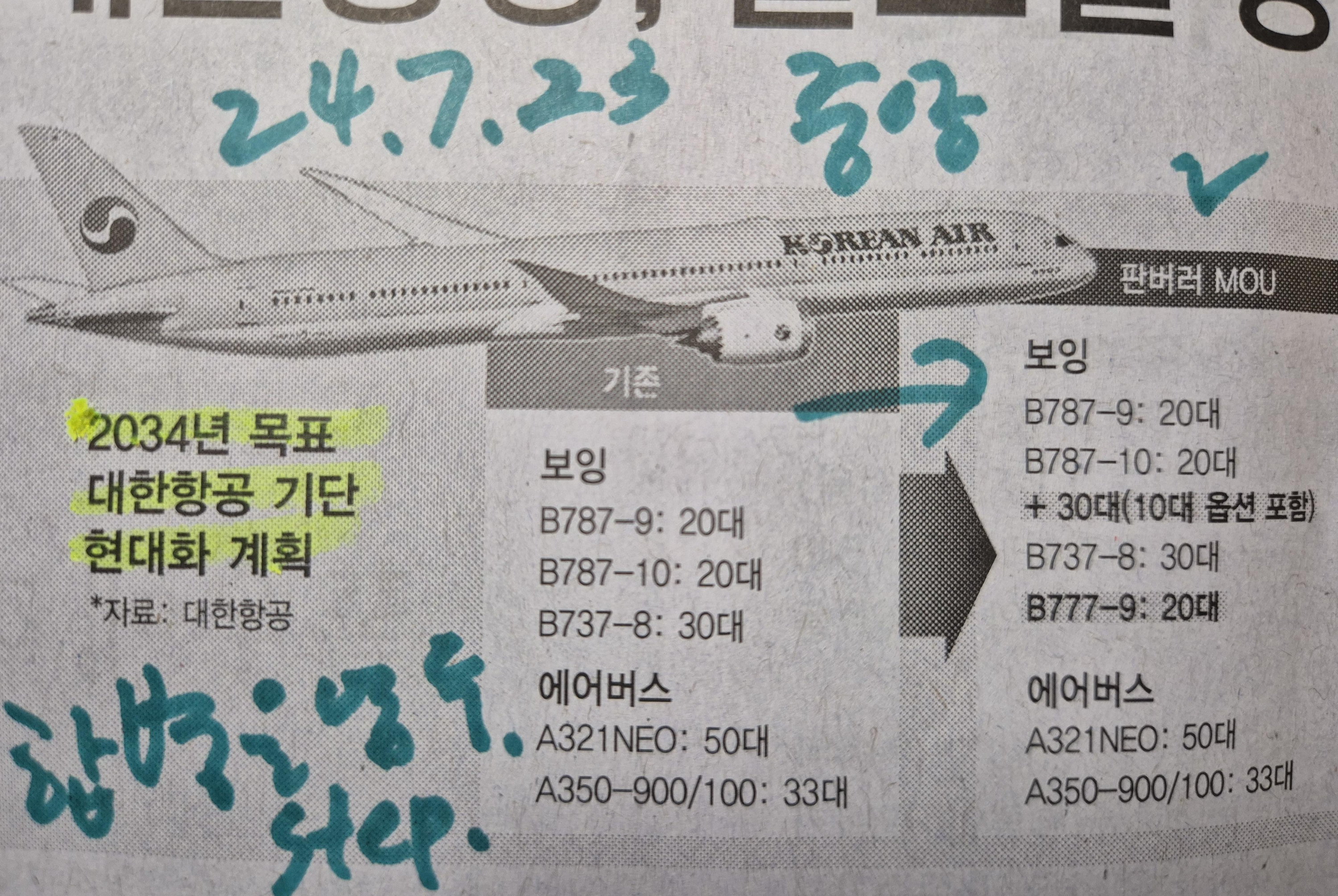 -새로운 기종인 777-9, 787-10 역시 미주, 유럽 등 장거리 운항에 기체의 성능을 끌어올릴 수 있는 기종이기에 합병 후 글로벌 항공사들과의 경쟁에 뒤처지지 않기 위한 스텝으로 생각된다.
