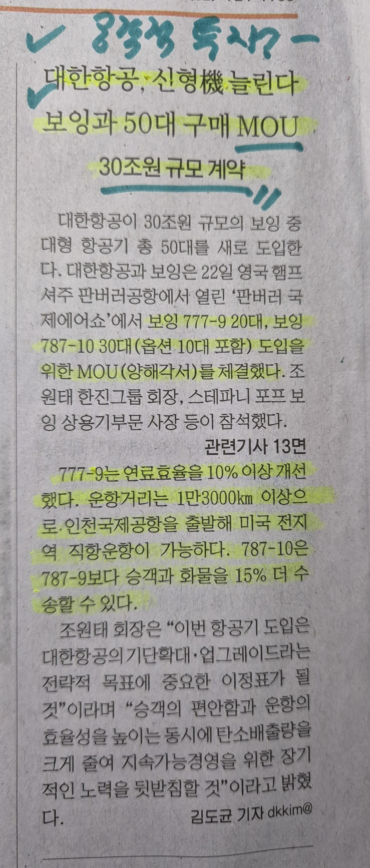 -대한항공이 영국 국제 항공쇼에서 보잉사와 50대의 신규 비행기에 대한 계약을 체결
