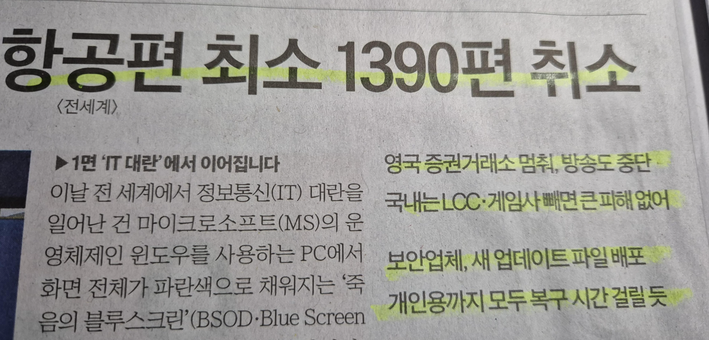 -원인은 미국 사이버 보안업체 크라우드스트라이크가 업데이트한 보안 프로그램인 ms의 운영체제인 윈도우와 충돌을 일으키면서 항공, 금융 기업의 컴퓨터 서버가 멈춰 선 상황이었다.