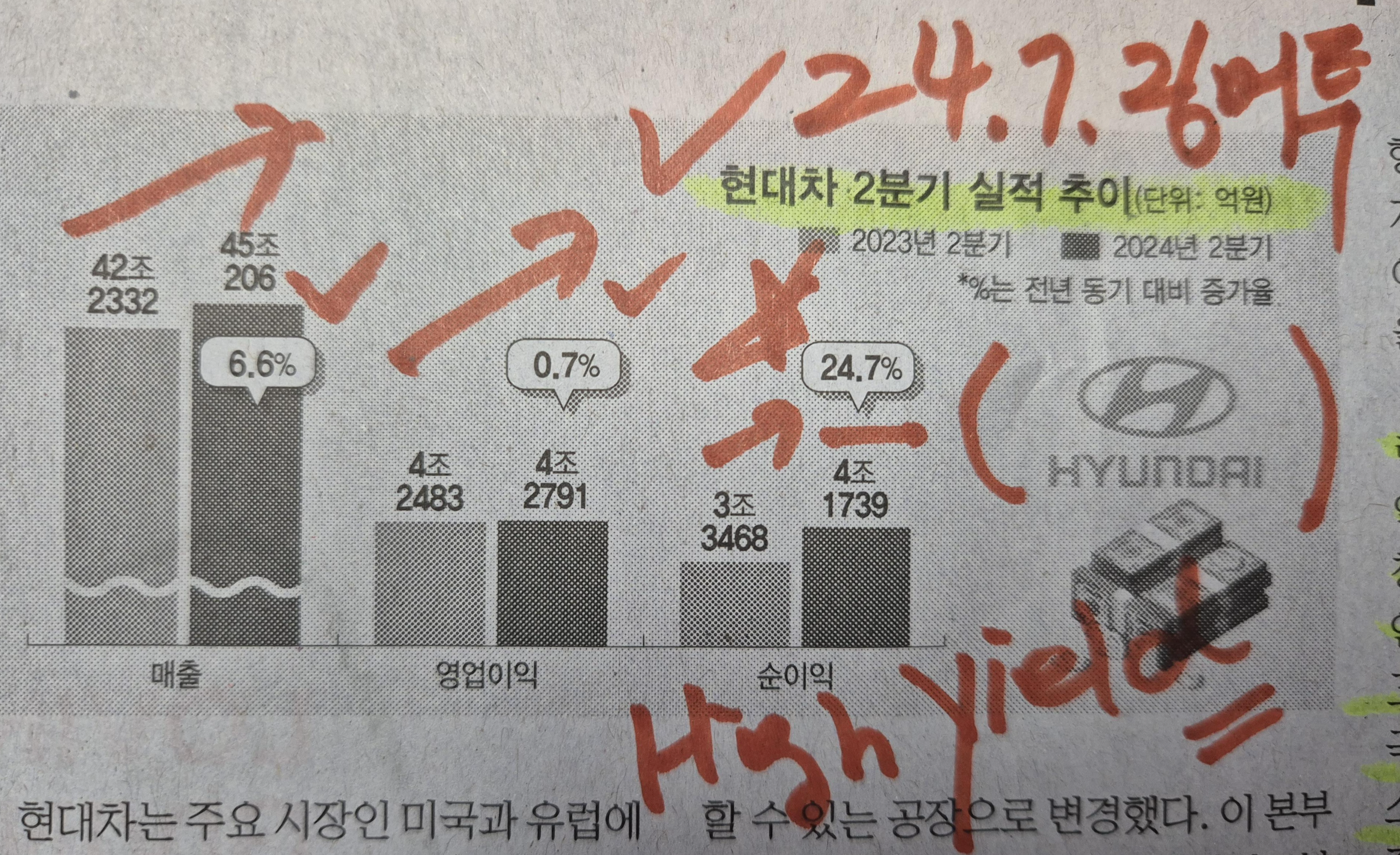 -현대차의 매출, 영업이익은 성장하였지만 눈에 띄는 정도는 아니었다. 하지만 수이익은 1년 전 대비