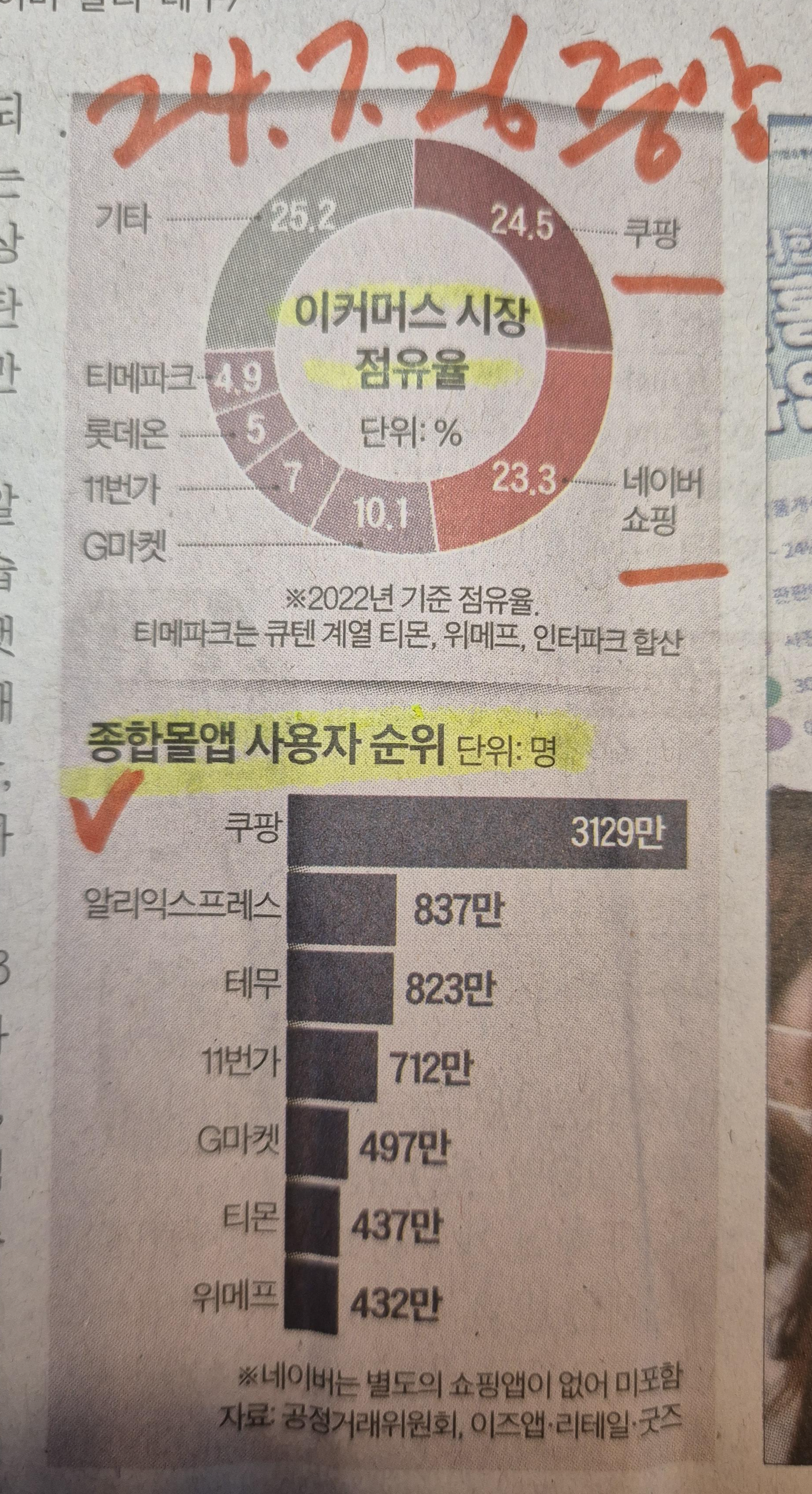 한국 이커머스 시장 점유율, 종합몰앱 사용자 순위는? 23.7.26 중앙