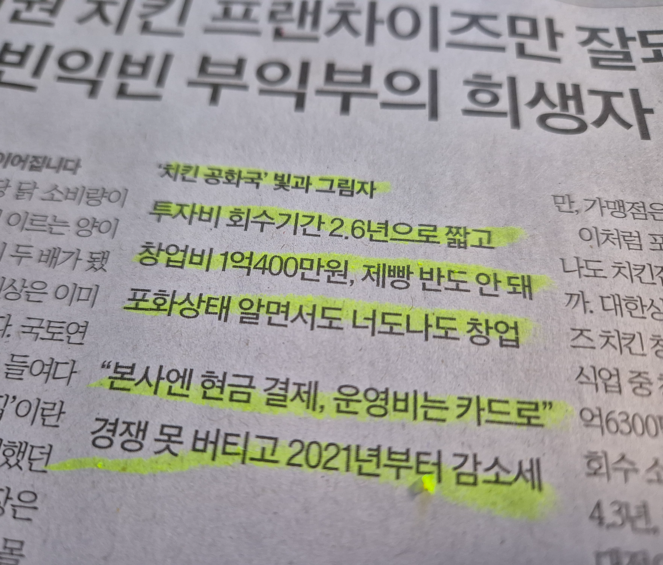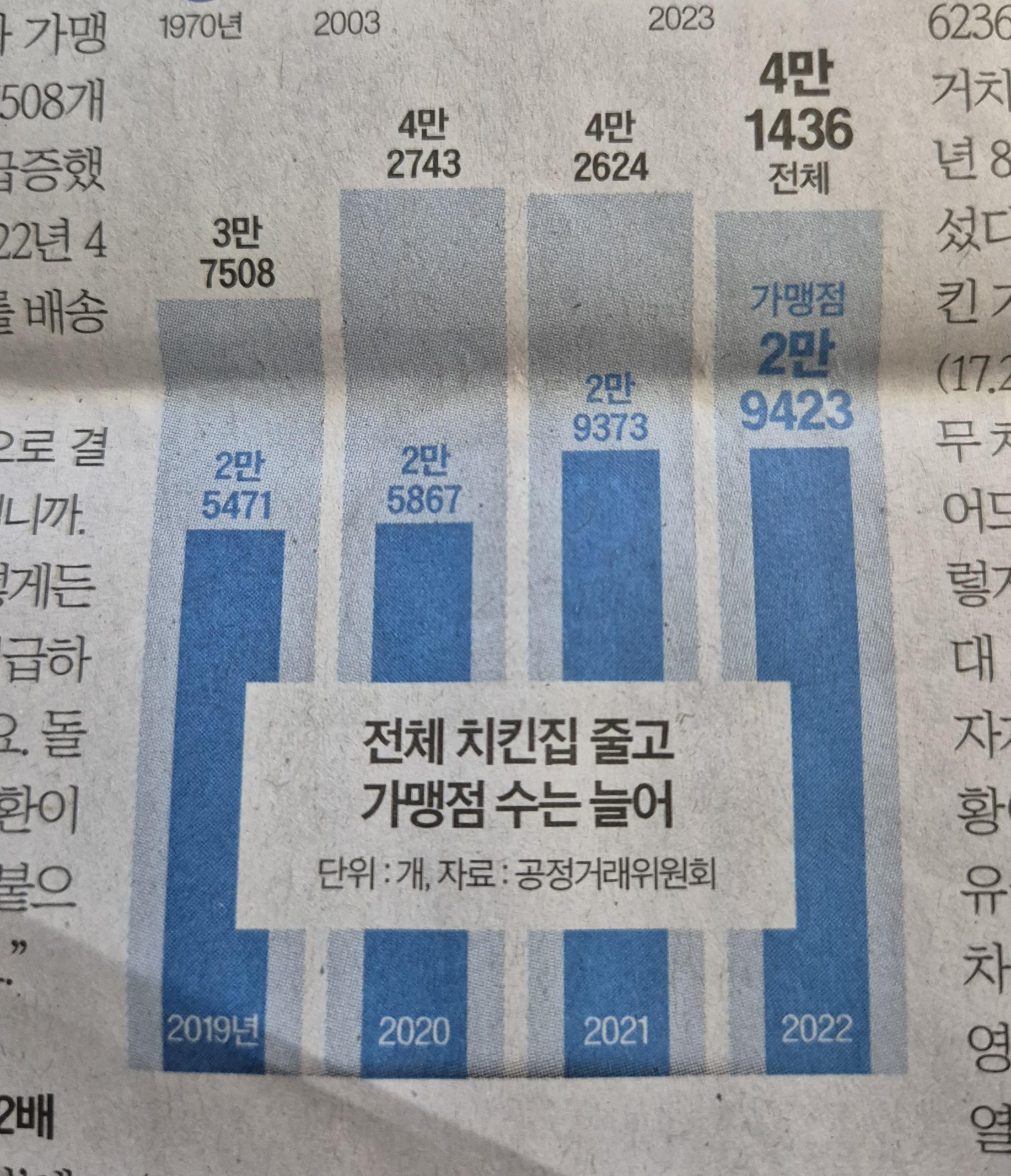 -하지만 전체적인 대한민국 불황으로 인하여 점차 치킨집은 줄고 있지만 가맹점은 늘어나는 기이한 상황. 한마디로 치킨 게임으로 인하여 전체적인 폐업이 늘어나고 있지만 관련 업종의 전체적인 숫자는 늘어나고 있는 상황이다.