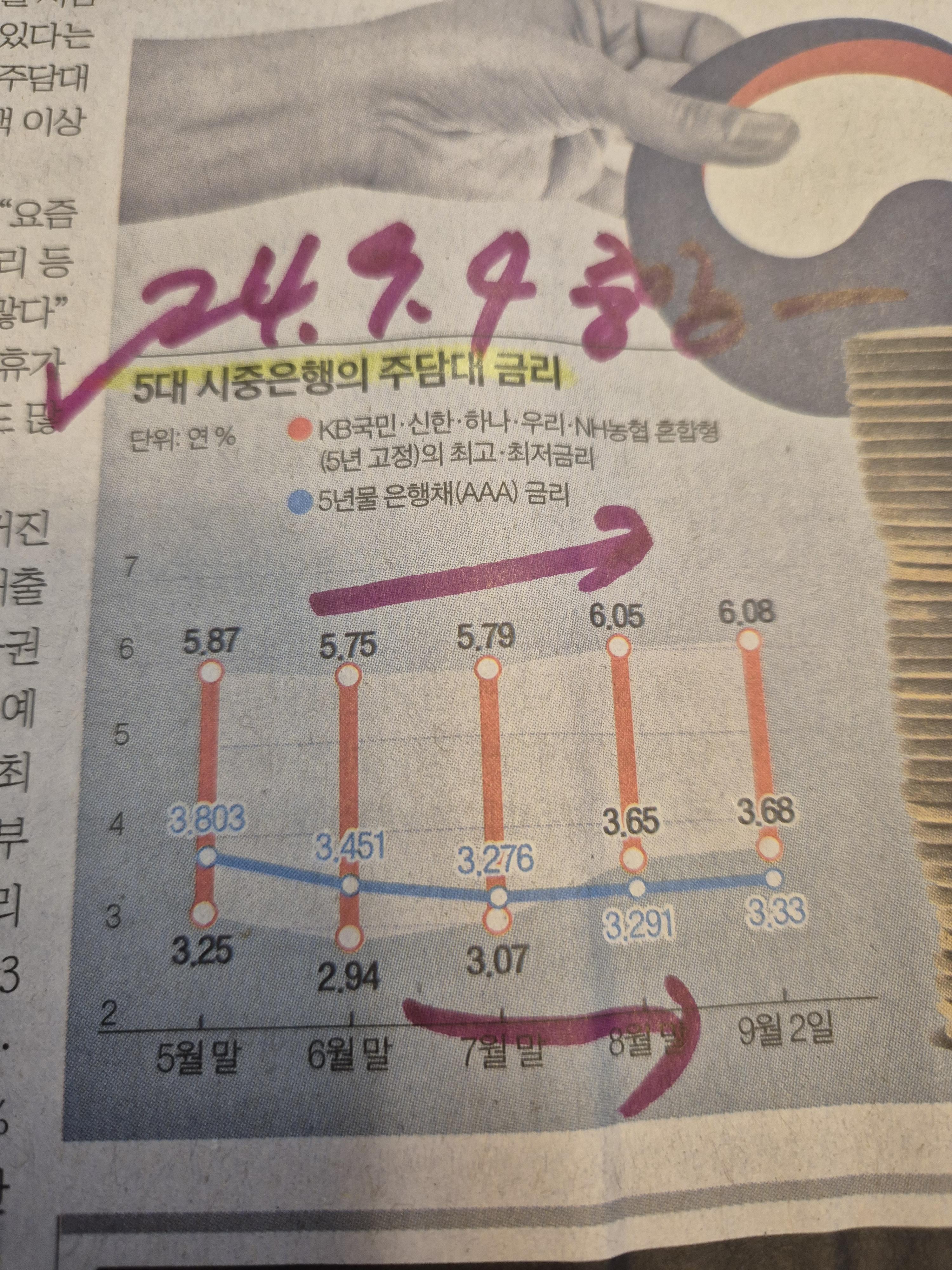 -주담대 금리는 8월 이후 6프로 이상 상승하는 모습인 반면, 예금 금리는 정체 혹은 하락되는 상황으로 9월을 맞이하고 있다.