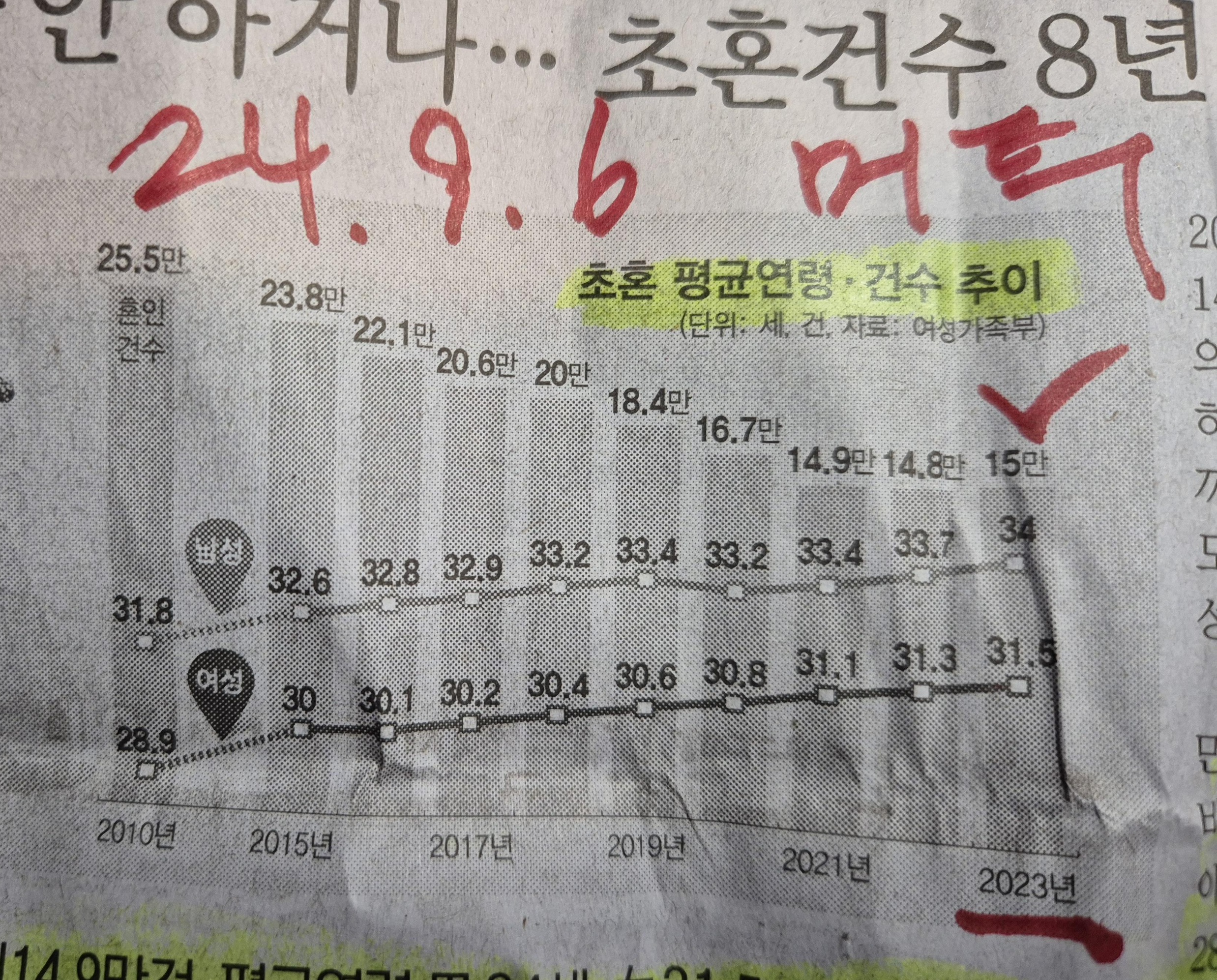 -2010년 25만 건에서 2023년 15만 건으로 10만 건 이상이 줄어들었고 반면 결혼의 평균 연령은 2010년 남성은 31.8세에서 34세로, 여성은 28.9세에서 31.5 세로약 3살 이상이 높아진 상황이다.
