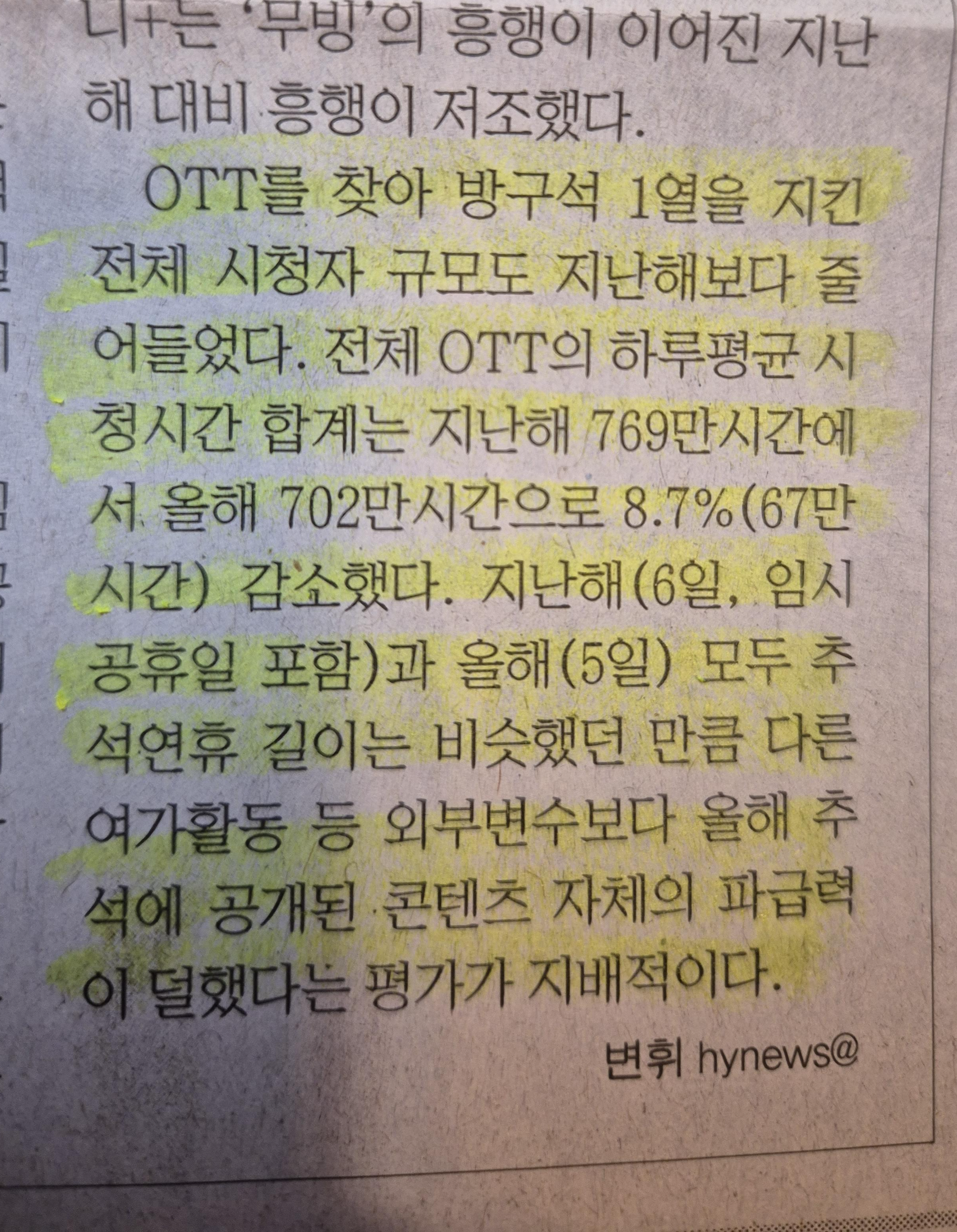 -가장 큰 이유라고 한다면, 작년에 비하여 올해 영화나 드라마 시리즈에서 볼 것이 줄어 시청시간 감소에 큰 영향을 미친 것으로 보인다.