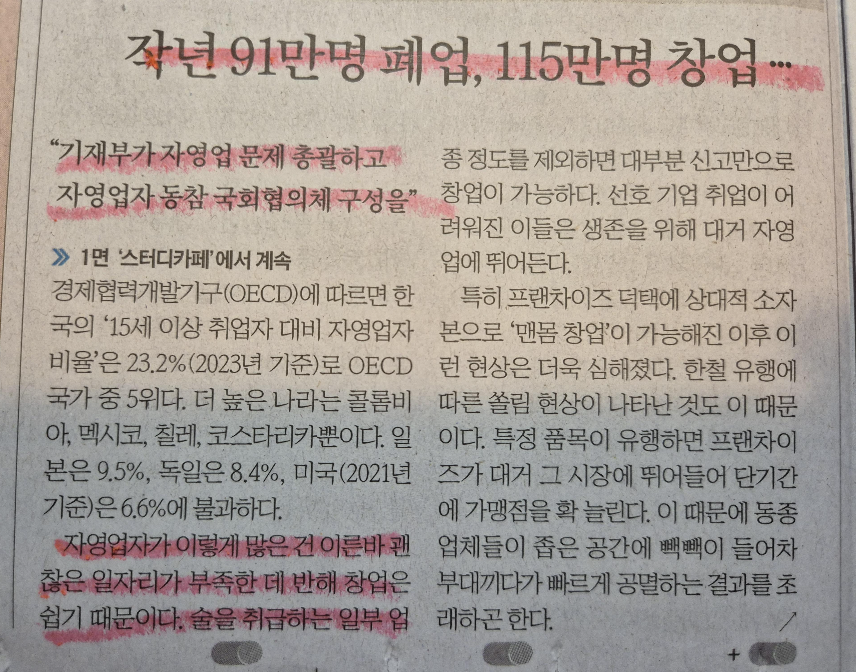 -대한민국의 현재는, 2023년 폐업을 91만명 하였지만 115만 명이 창업하였다 지표이다. 치킨 게임과 같은 현실이 더욱 강화되고 코로나 이후 높아진 물가로 인하여 사람들의 소비는 더욱 줄어들고 있다는 점이다.