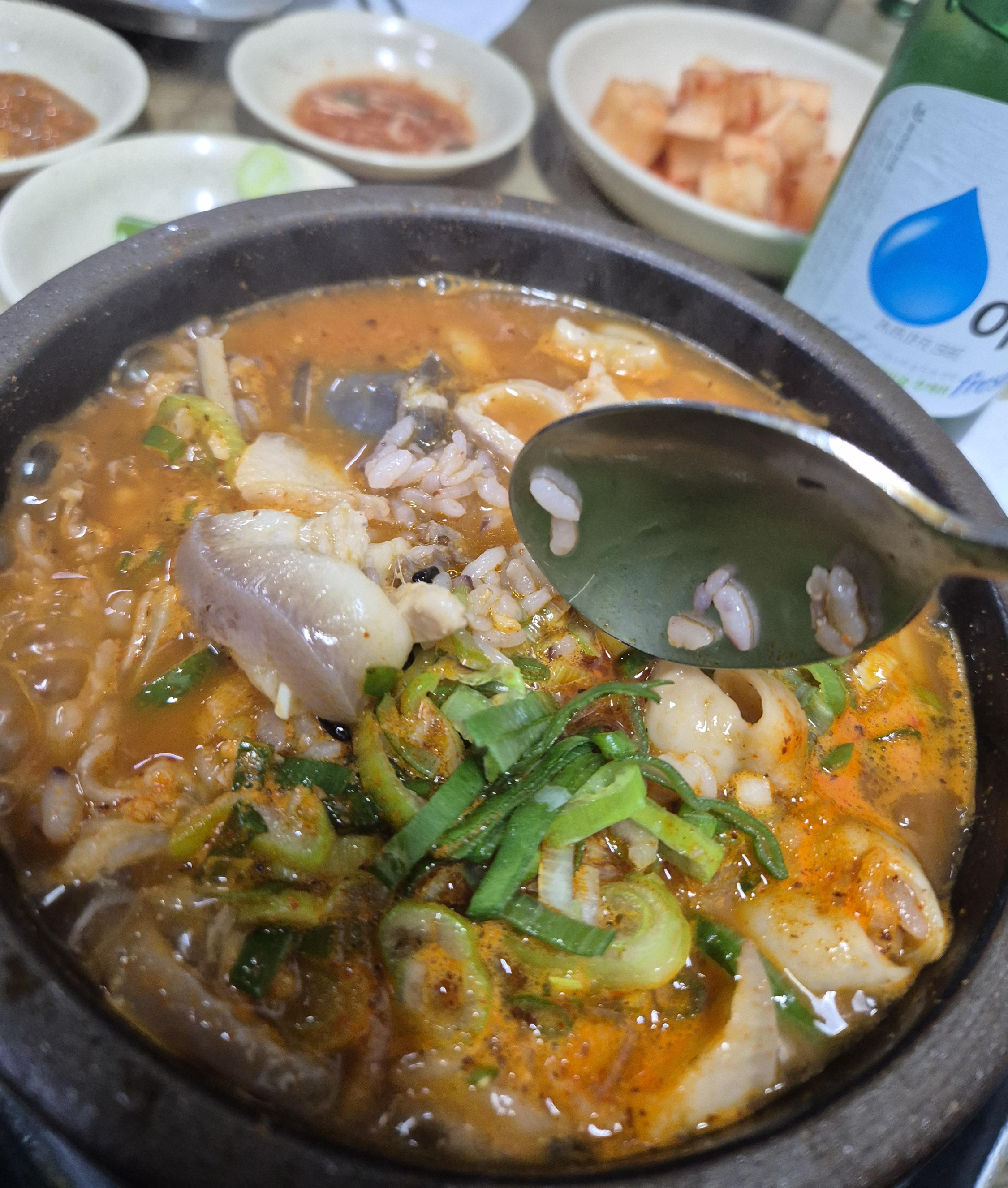 반찬은 깍두기, 새우젓, 된장과 고추 그리고 생파 줄기 부분.. 여전한