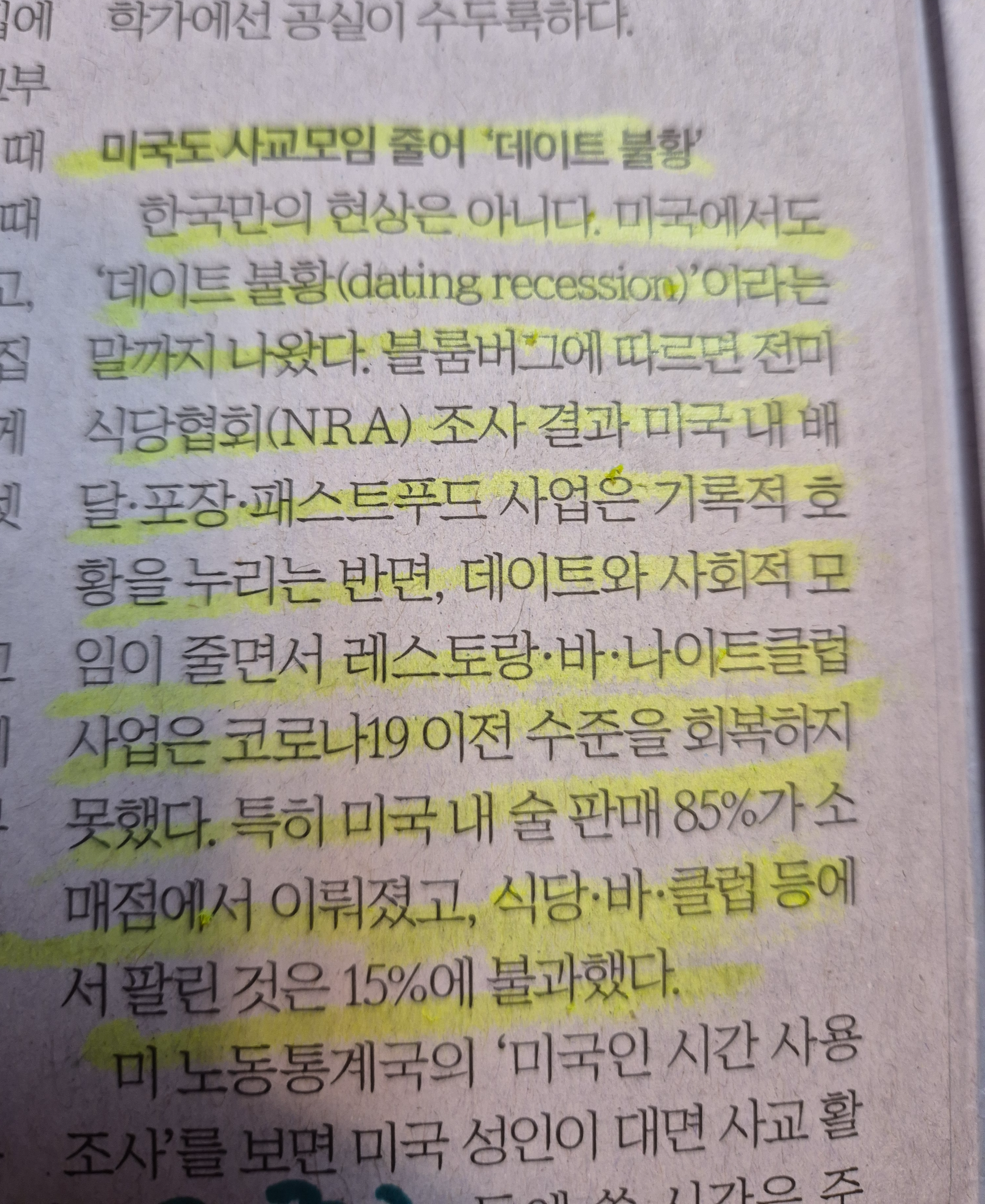 -미국 또한 같은 상황, 사교모임이나 젊은 사람들이 만나는 상황이 줄어 이러한 상황을 '데이트 불황' 이라는 용어까지 나왔다고 한다. 배달, 포장, 패스트푸드 사업은 호황인 반면 레스토랑, 바, 나이트클럽과 같이 이성을 만날 수 있는 공간에 대한 수요는 예전보다 줄어든 것이 눈에 띈다.