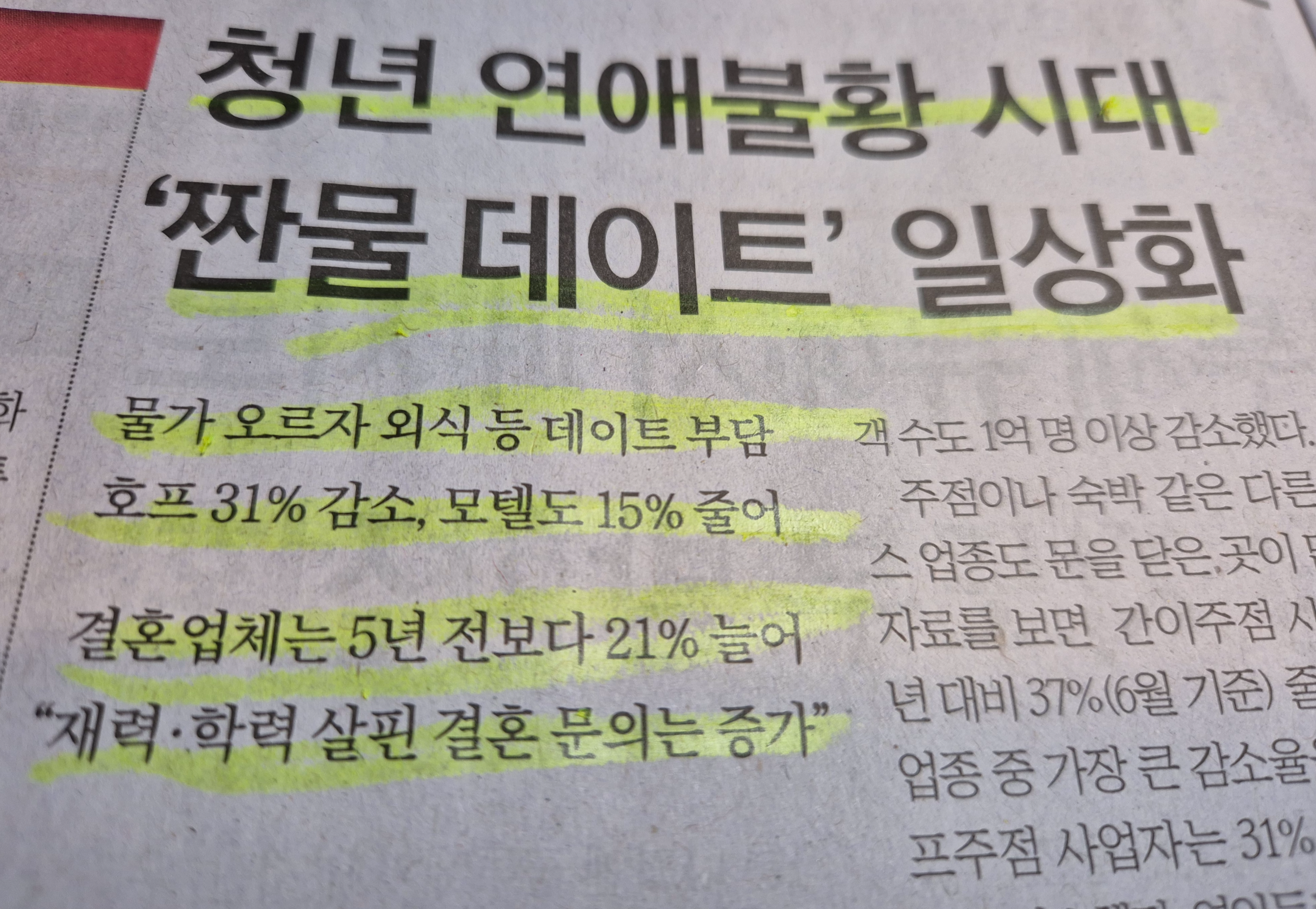 -젊은 층의 감소와 코로나이후의 급격한 물가 상승으로 인하여 데이트 코스였던 주점과 모텔의 불황이 지속되고 있다. 비즈니스 호텔도 최근에는 20만 원이 대부분 넘어가는 상황에서 한번 데이트 시 7-8만 원 내외의 주점비용, 모텔비 10만 원 내외 추가로 차까지 사용한다면 한번 데이트 비용만으로도 20만 원이 훌쩍 넘어갈 것으로 예상된다.