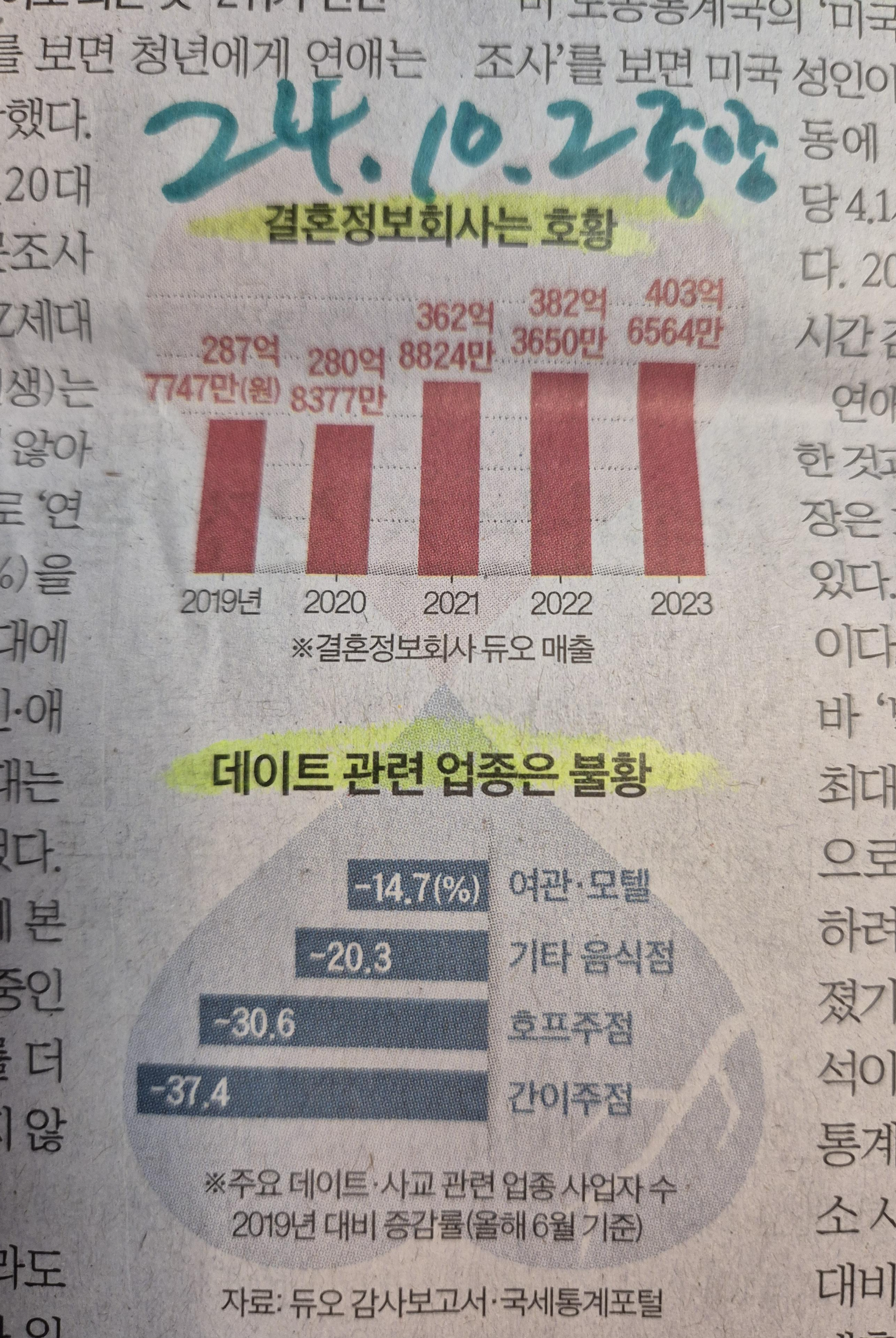 -예전 결혼정보회사가 결혼 적령기 젊은 사람들의 감소로 인하여 향후 몇 년 안에 폐업하는 곳이 속출할 것이라는 기사를 보았던 것이 기억이 난다. 하지만 세상은 한 단면만으로 보기에는 복잡하는 것이 이러한 보고서를 통해 드러나고 있다.