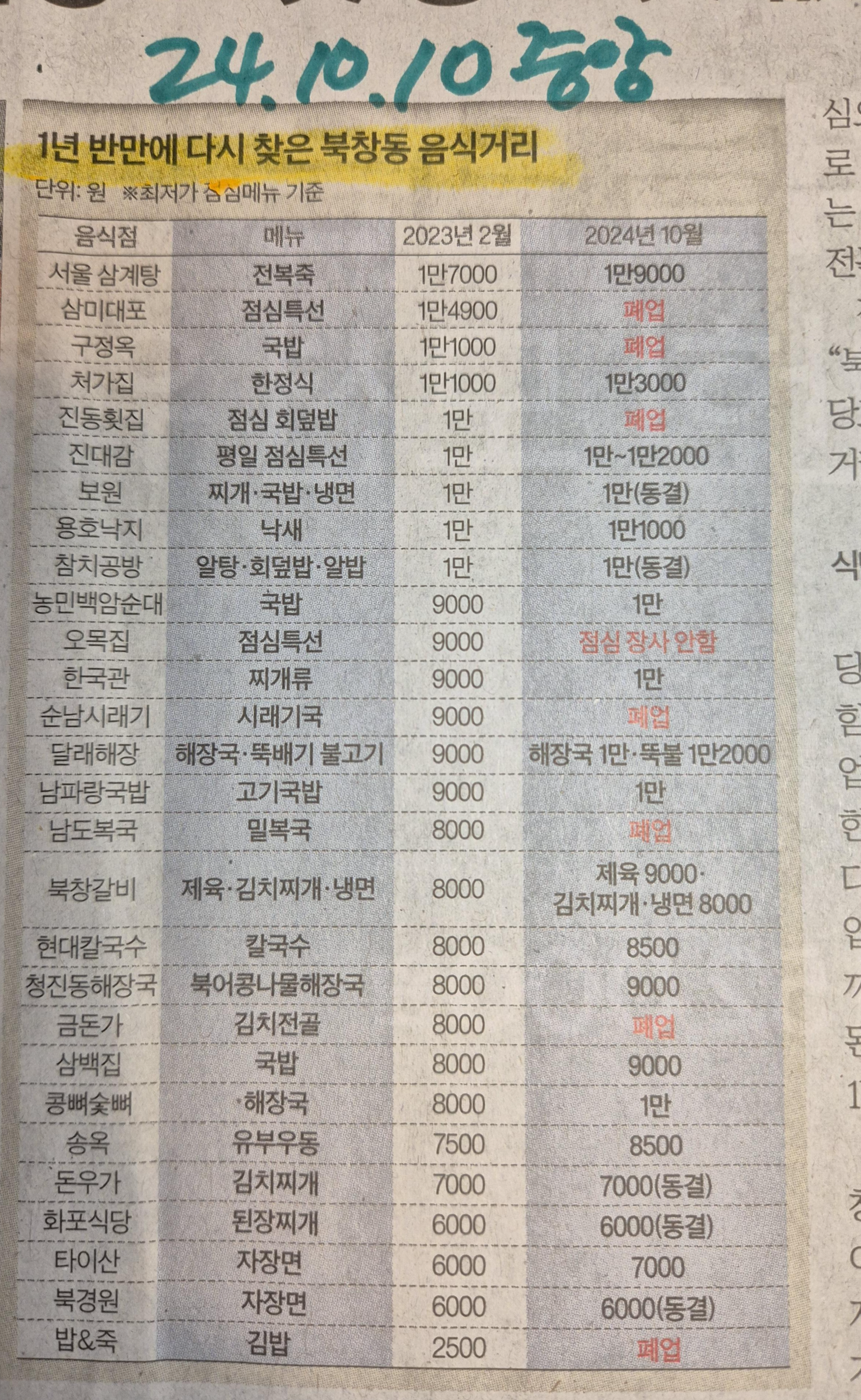 -시청 주변 북창동 음식거리는 언제나 사람이 많았지만 코로나 시기 그리고 코로나 이후에도 치솟는 물가로 인하여 영향을 많이 받는 듯하다. 1년 6개월 전 기준 대부분의 음식점은 1-2천 원 인상 혹은 동결 그리고 폐업까지 28곳 중 7곳은 폐업한 상황이다.