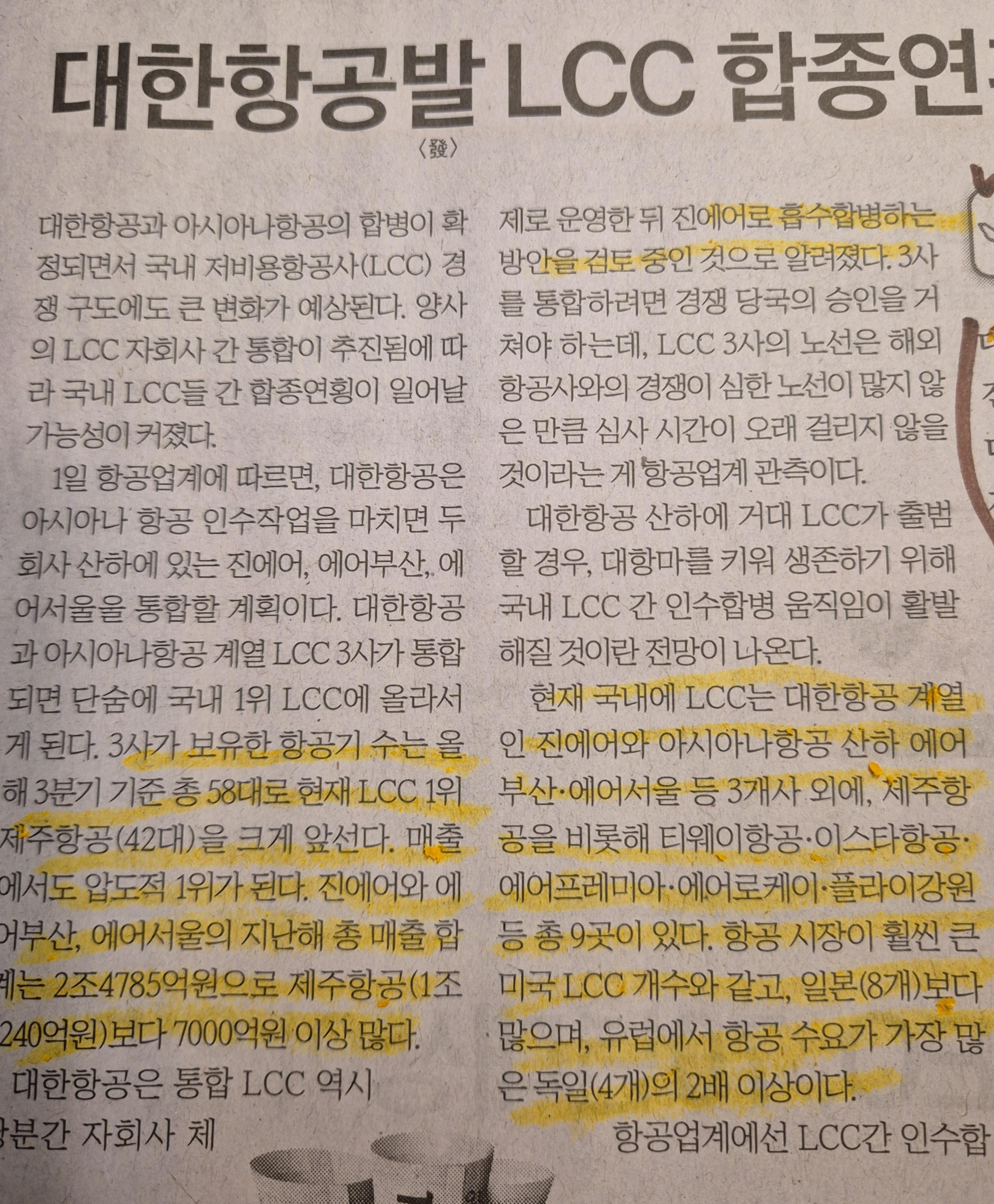 -기사의 말미와 같이 대한민국의 LCC 항공사의 수는 항공 시장이 훨씬 큰 미국과 같은 수준이라 효율화 통합화를 위해 합병에 대한 이야기는 지속적으로 나올 것으로 보인다.