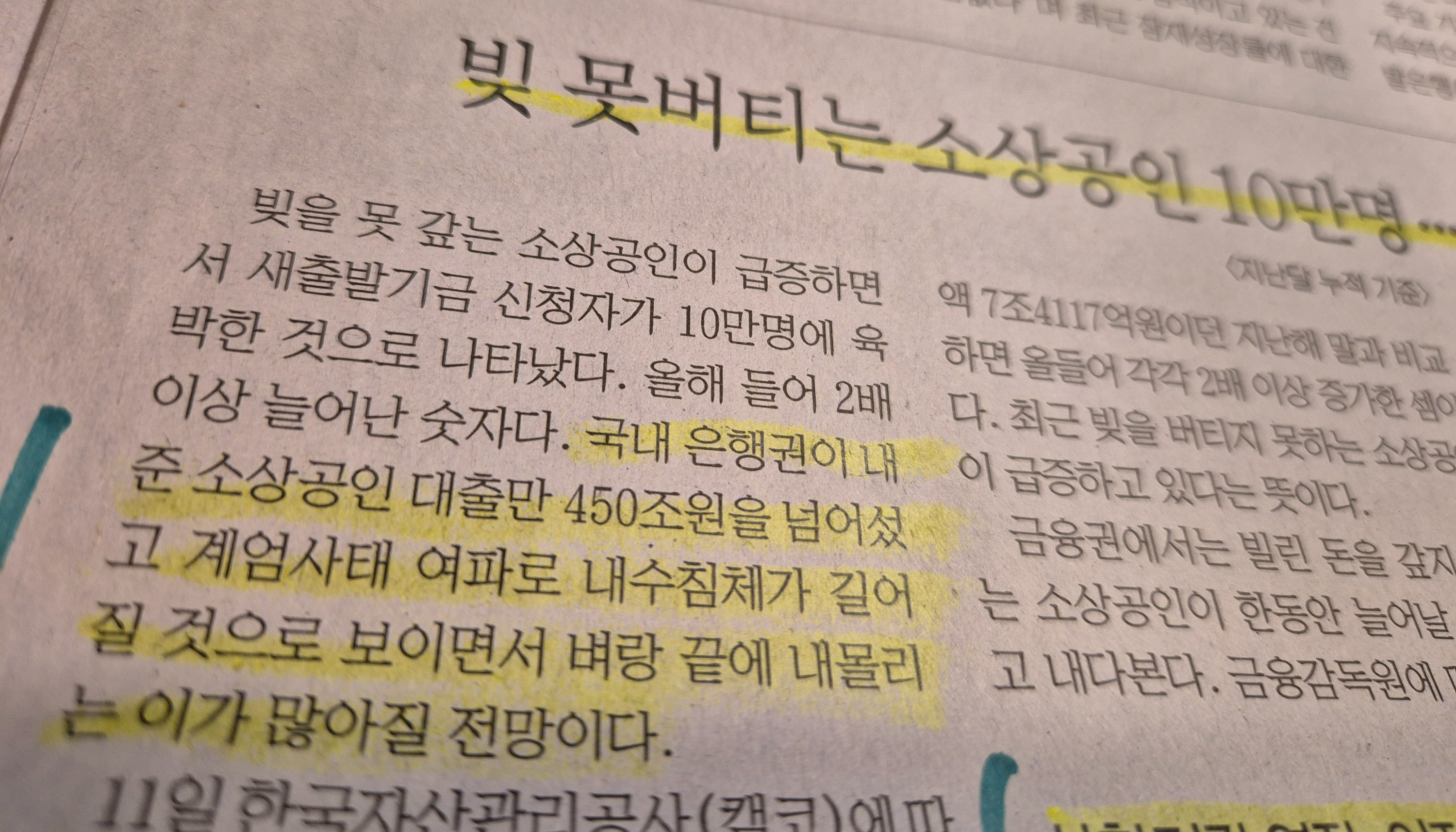 -국내 은행권이 내준 소상공인 대출만 450조원을 넘어선 상황이다. 부동산 대출은 규제를 하지만 소상공인의 경우 국민 생활과 연결되어 있기에 정부에서도 견제를 못하다 보니 기하급수적으로 늘어나는 상황이다. 문제는 수출부진 및 계엄등의 사태로 인하여 내수침체가 살아날 기미가 없기에 대출 연체로 인한 벼랑 끝이 바닥이 안 보인다는 것.