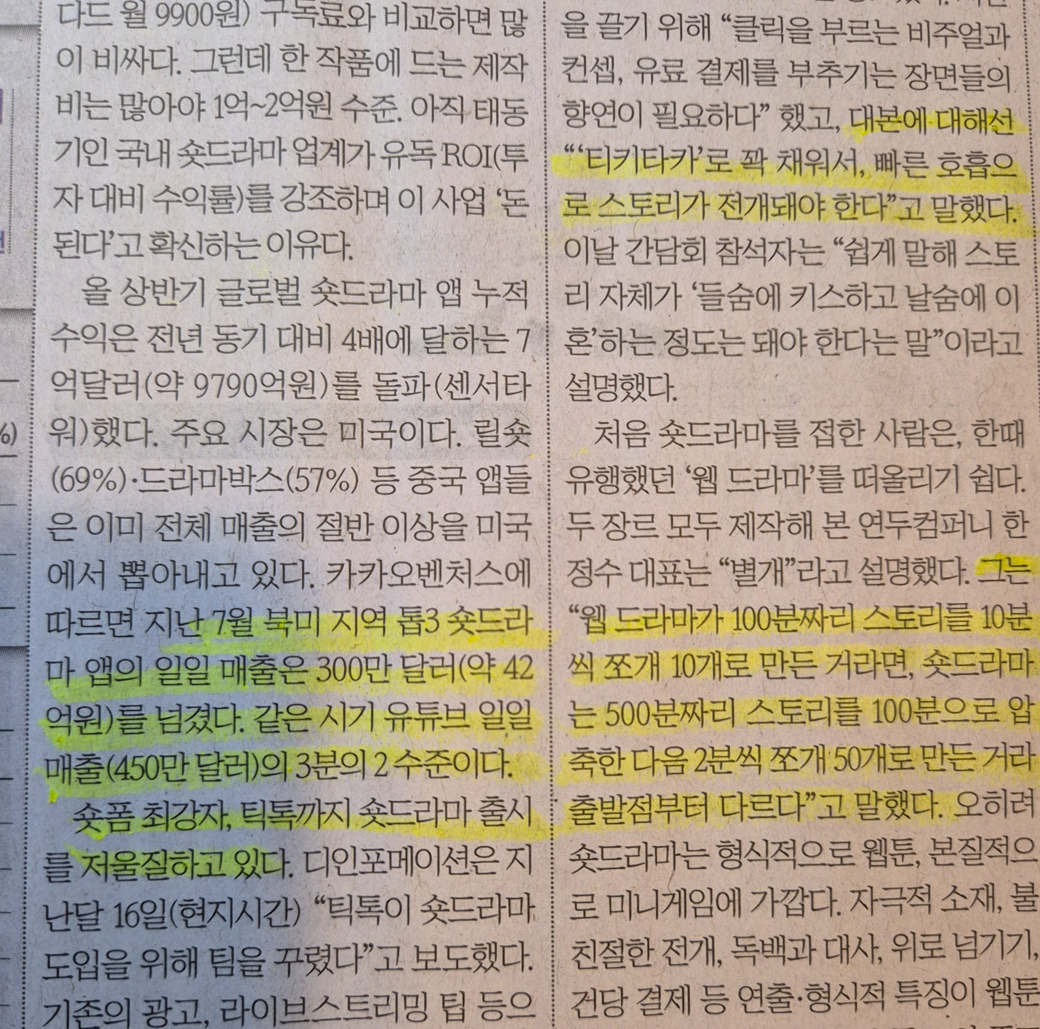 -웹 드라마가 100분짜리 스토리를 10분씩 쪼개 10개로 만든 거라면, 숏드라마는 500분짜리 스토리를 100분으로 압축한 다음 2분씩 쪼개 50개로 만든 거라 출발점 부터 다르다.
