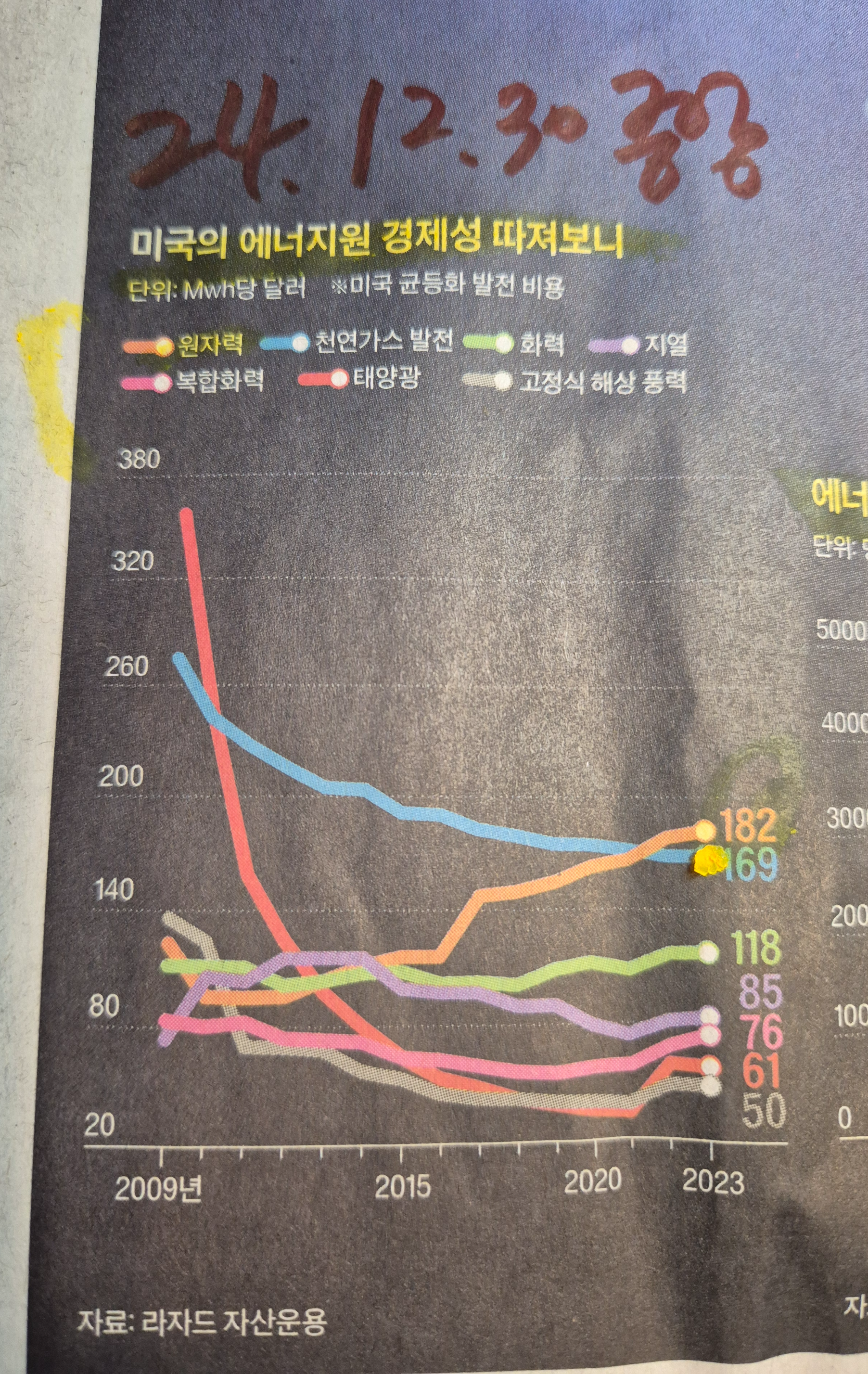 -미국 에너지원의 경제성을 보면 시대가 보인다. 2009년 태양광 열풍의 이유가 가장 높은 효율성을 가진 에너지였다는 것 하지만 이후 하락하여 2023년 하위권을 차지하고 있다.
