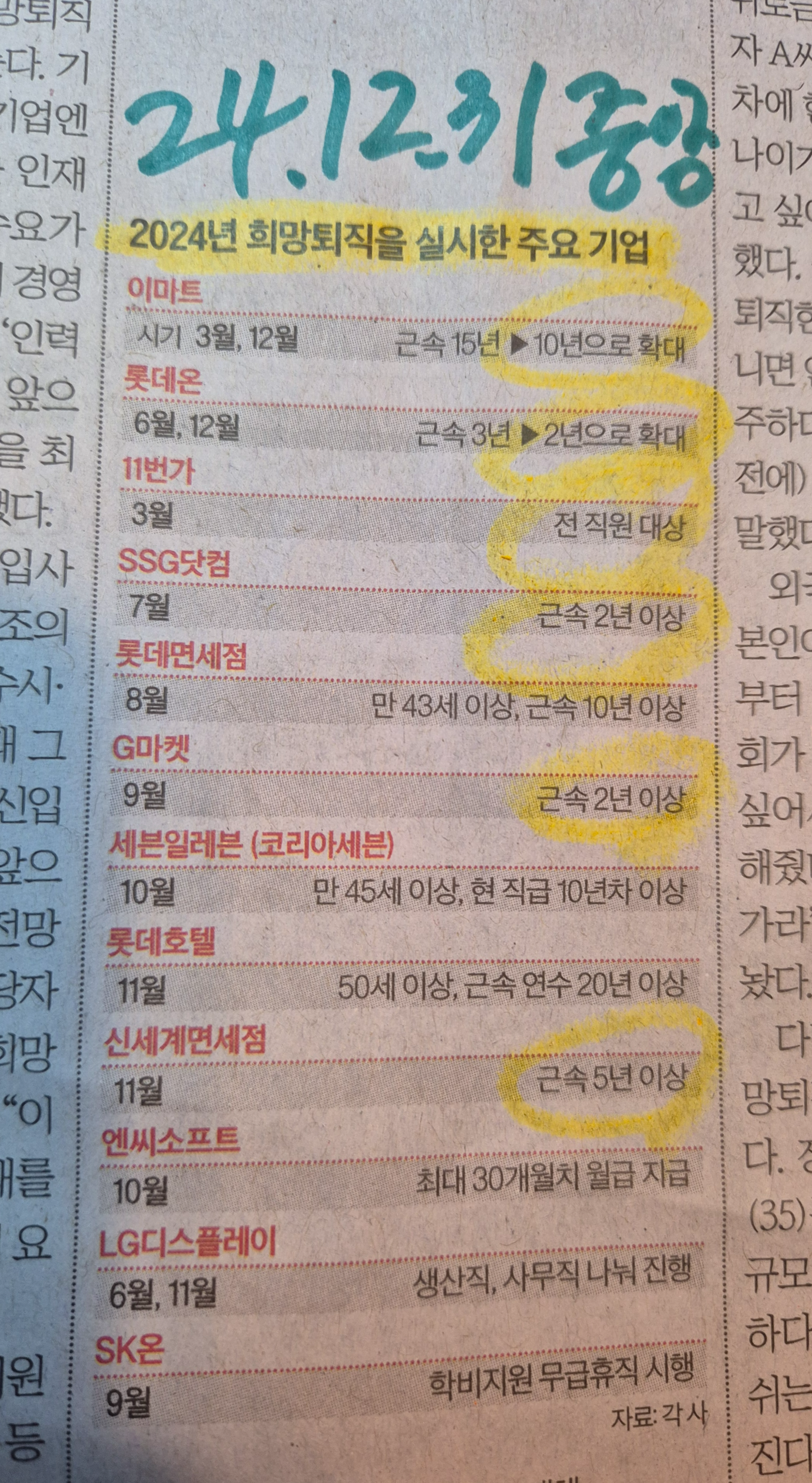 -2024년 대기업의 희망퇴직 바람은 내내 계속되었다. 예전 기업들은 보통 10년 차 이상을 대상으로 하였다면 최근에는 최소 2년 이상의 근무자 또한 희망퇴직자로 포함된 기업도 있었다.