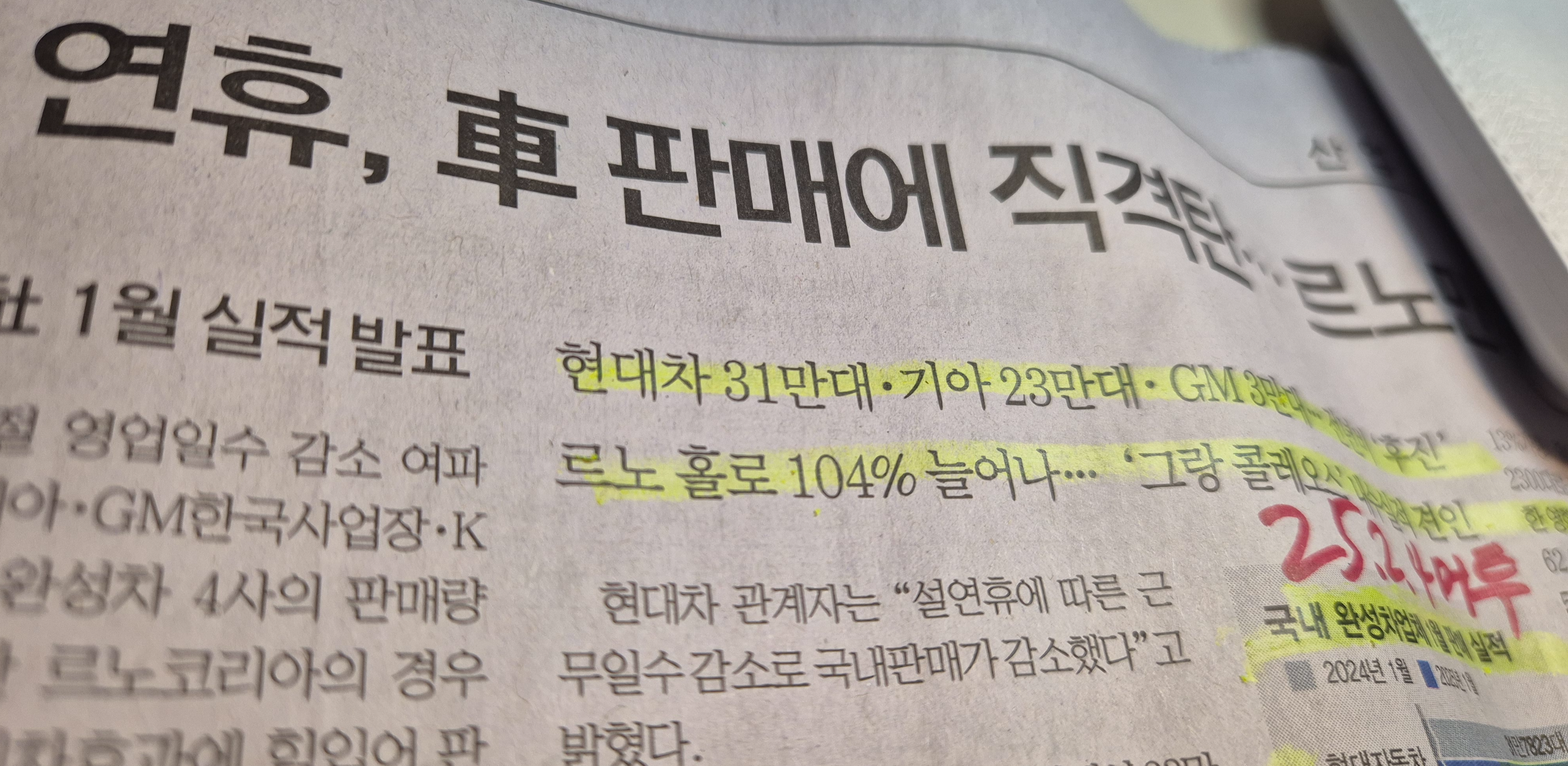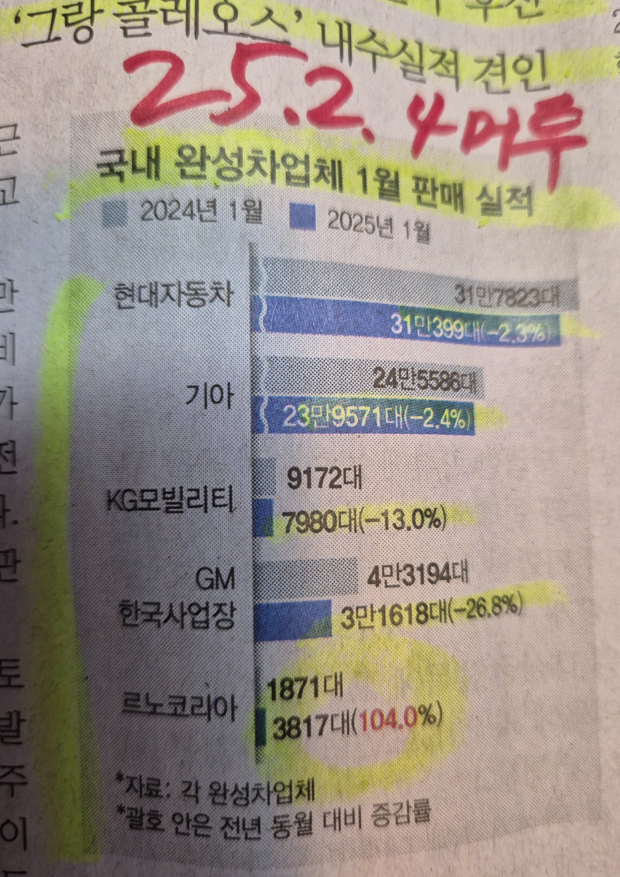 -현대 31만 대, 기아 23만 대 , GM 3만 대를 기록하였다. 전체적으로 전년 대비 판매 감소 상황으로 확인된다.