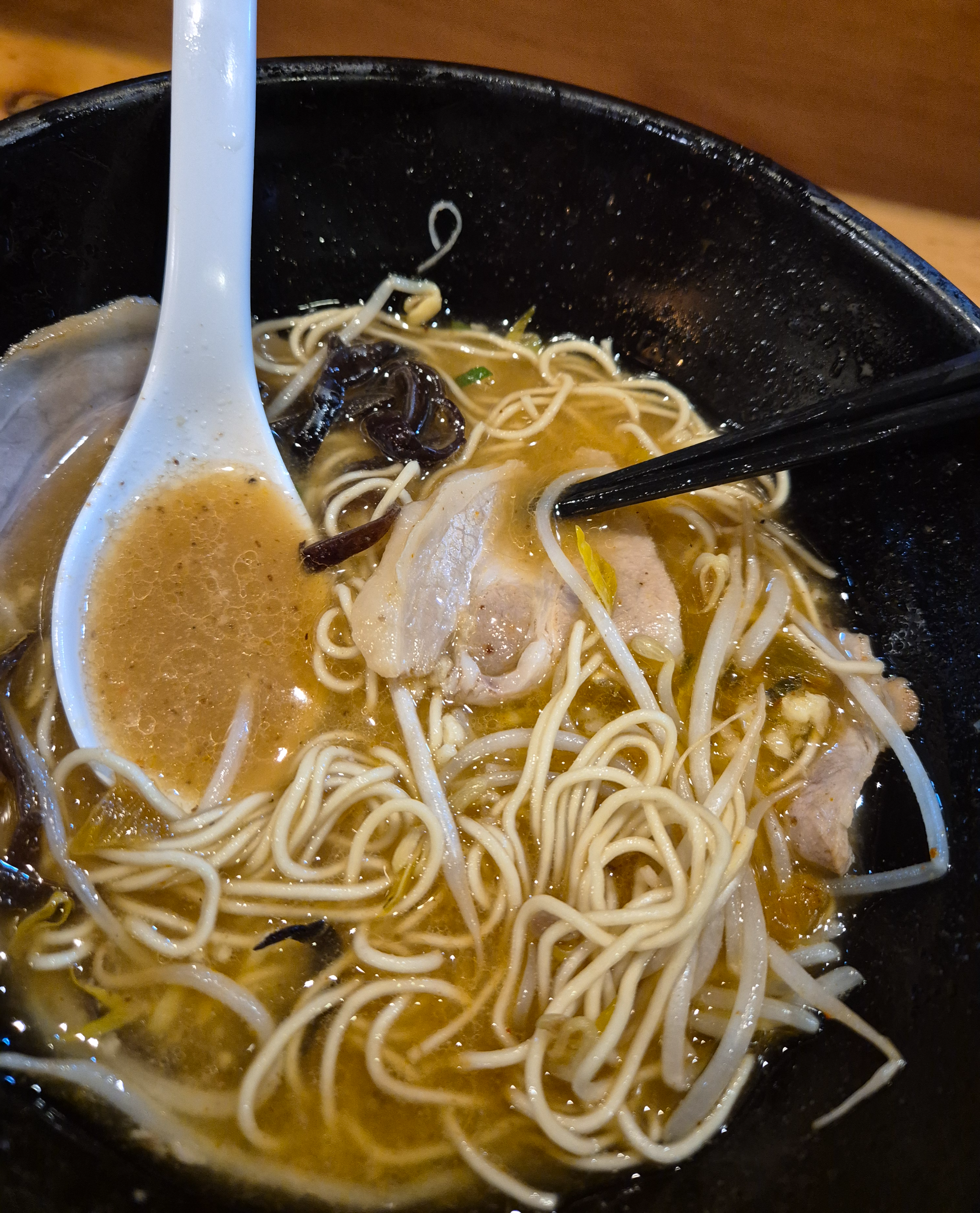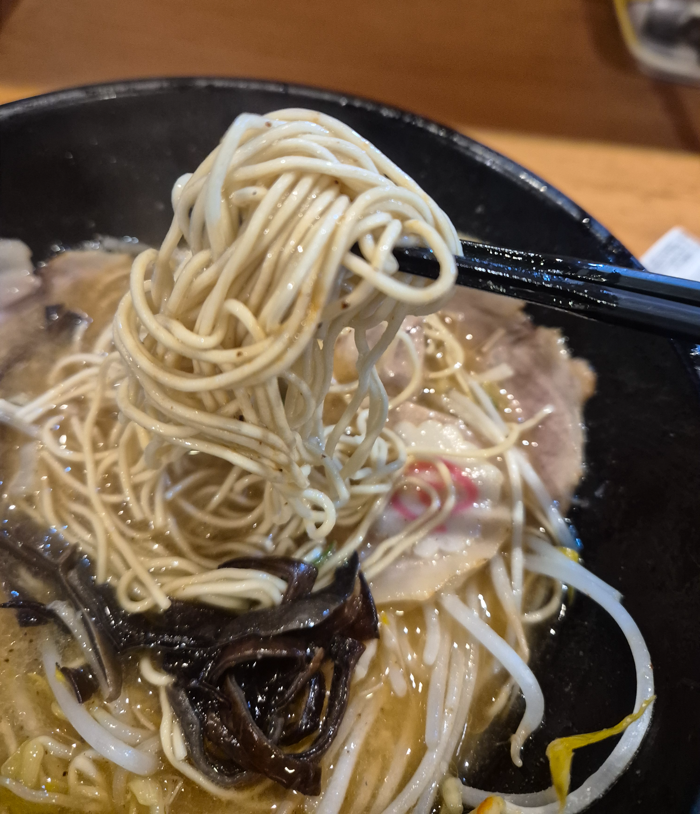 보통 이 라멘은 "가타(硬) 스타일"로 불리며, 면이 꽤 단단하게 삶아져 있어 씹는 맛이 특징입니다. 간장(쇼유) 베이스의 국물이 많은 라멘과 비교할 때, 텐진라멘은 국물이 좀 더 진하고 고소한 맛이 강조됩니다.