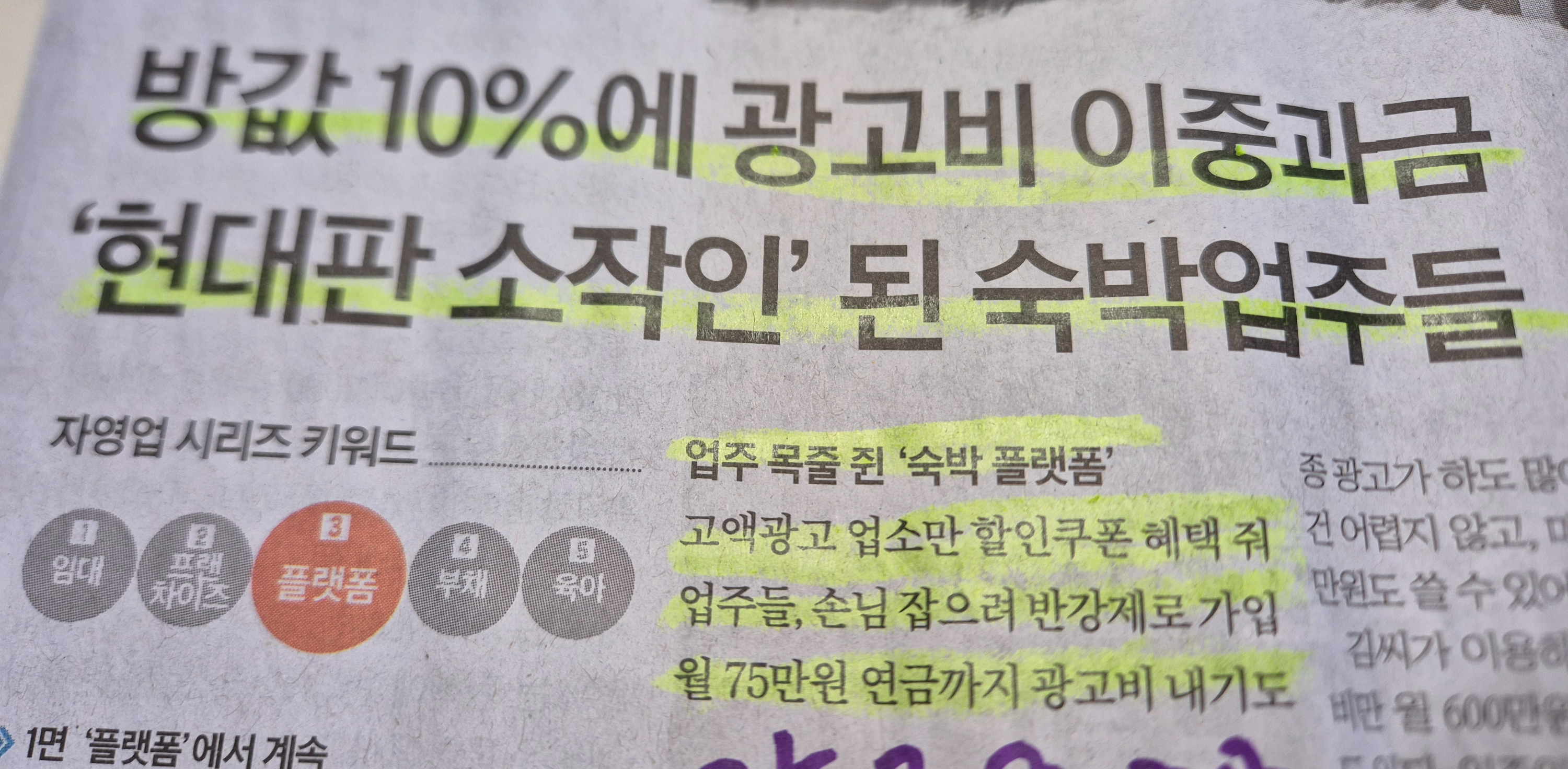 -숙박 플랫폼 또한 고액광고 업소만 할인쿠폰 혜택을 주며, 매달 몇십만 원에 달하는 광고비를 지속적으로 지출해야만 고객을 유치할 수 있는 상황이라고 한다.