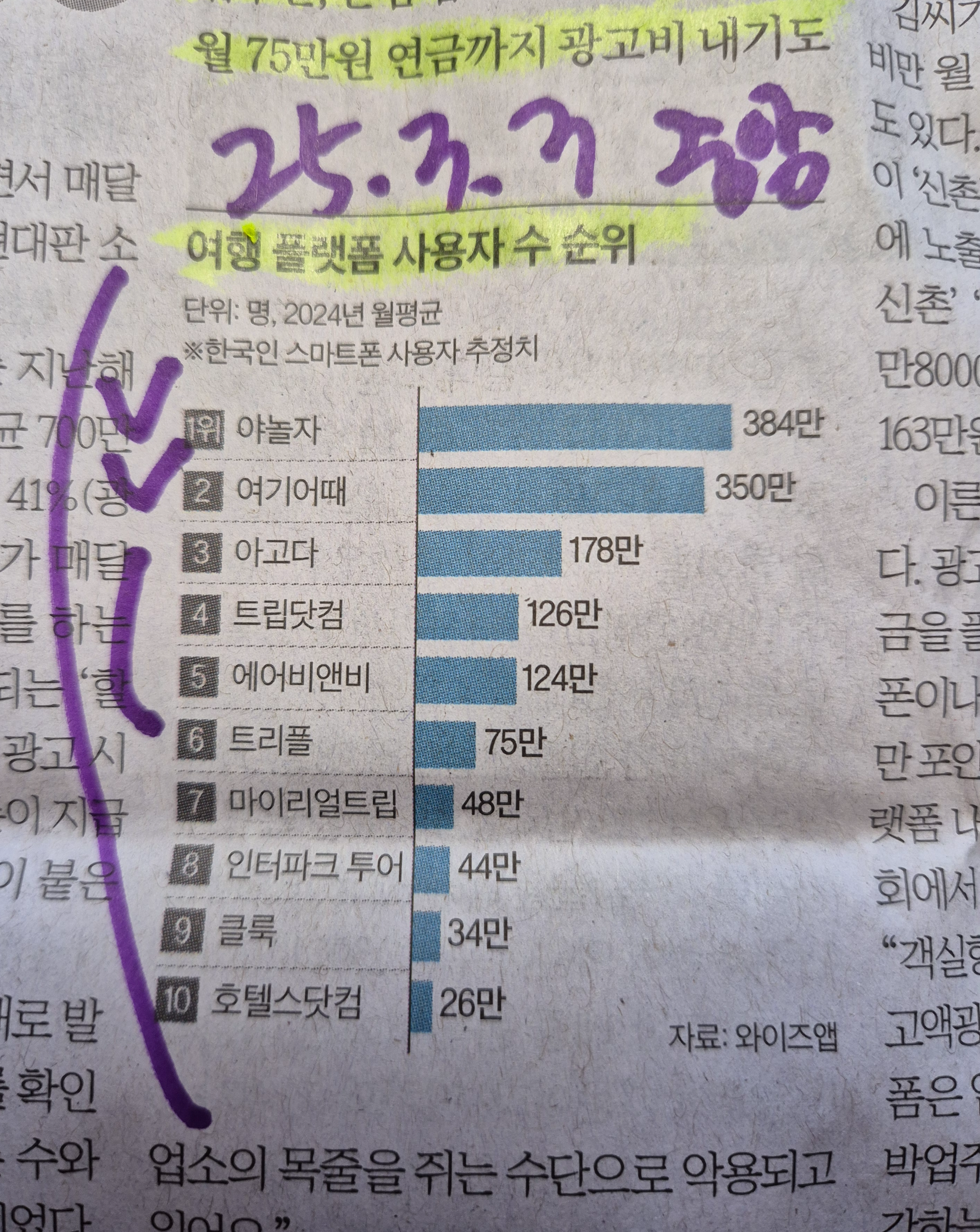 -우리나라 여행 플랫폼의 순위는 1위 야놀자, 2위 여기어떄 로 국내 기업들, 그리고 3-5위는 아고다, 트립닷컴, 에어비앤비로 글로벌 플랫폼이 차지하고 있다.