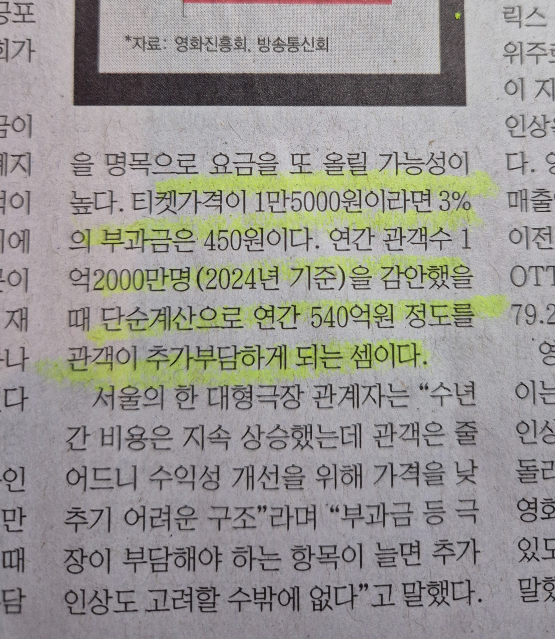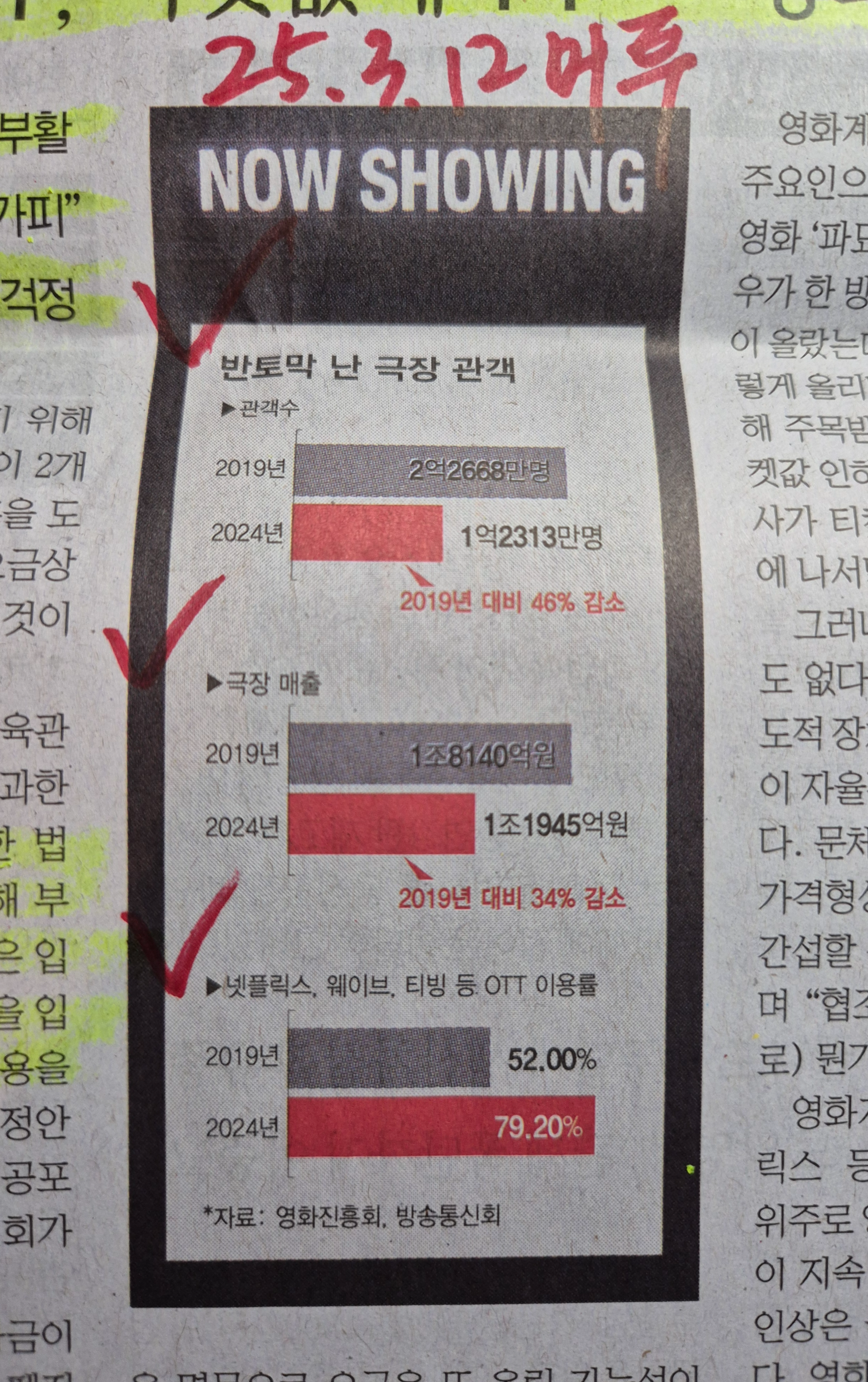 -극장산업 상황이 보고 된다. 2019년 기준 2024년 관객수는 절반 수익은 40% 이상 감소한 것으로 확인된다.