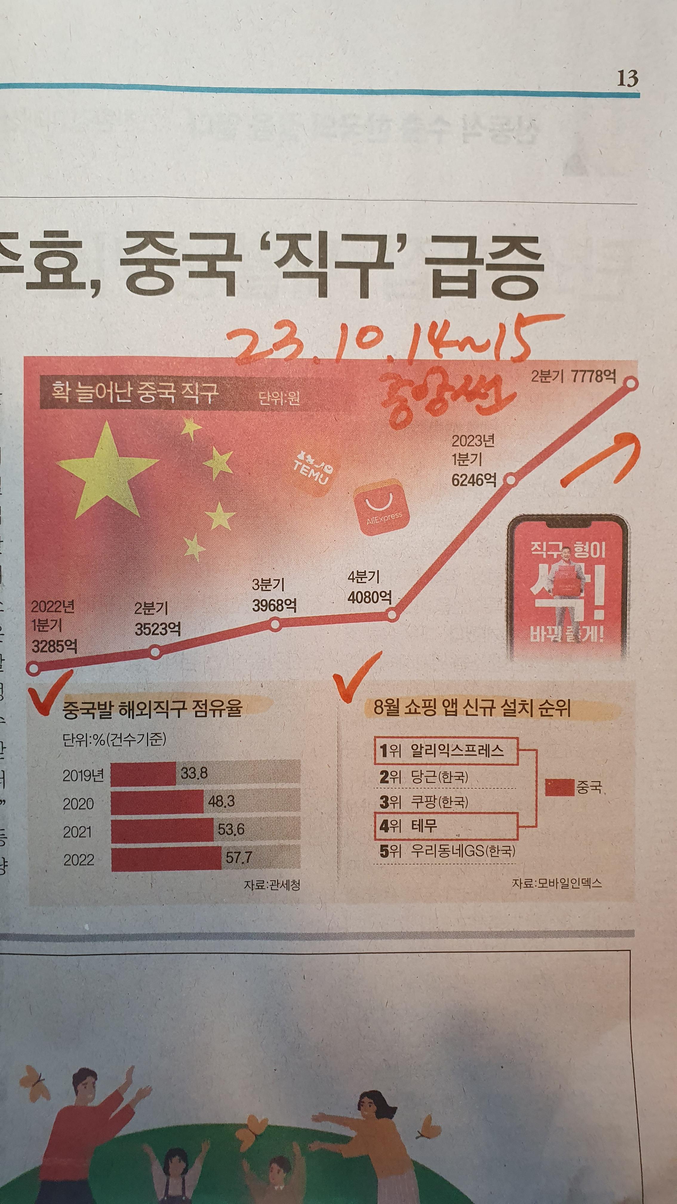 -중국 직구 금액은 1년만에 한 분기 3천억원에서 7천억원 이상으로 2배 이상의 성장률 -중국발 해외직구 점유율은 매년 상승하여 2022년 기준 57% 이상을 차지 -지하철, 버스에서 공격적으로 마케팅하는 곳은 역시나 알리익스프레스 , 8월 쇼핑 앱 신규 설치 순위에서 1위를 차지하였다. -소형가전제품, 캠핑용품 등 가격대비로는 성능이 만족스러운 제품들이 많이 팔리는 편 -직구인 만큼 as나 서비스 불만은 큰 상태 Comment)) 예전부터 서비스 중인 알리였지만 최근들어 1000억원의 투자를 이야기하면서 마케팅과 공격적인 서비스 제공이 이루어지고 있다. 마동석 아저씨가 광고에 나오면서 더욱 사람들의 관심을 끌었는데 소형 가전제품 사용이나 가성비 제품을 원하는 고객층에 만족. https://www.joo..