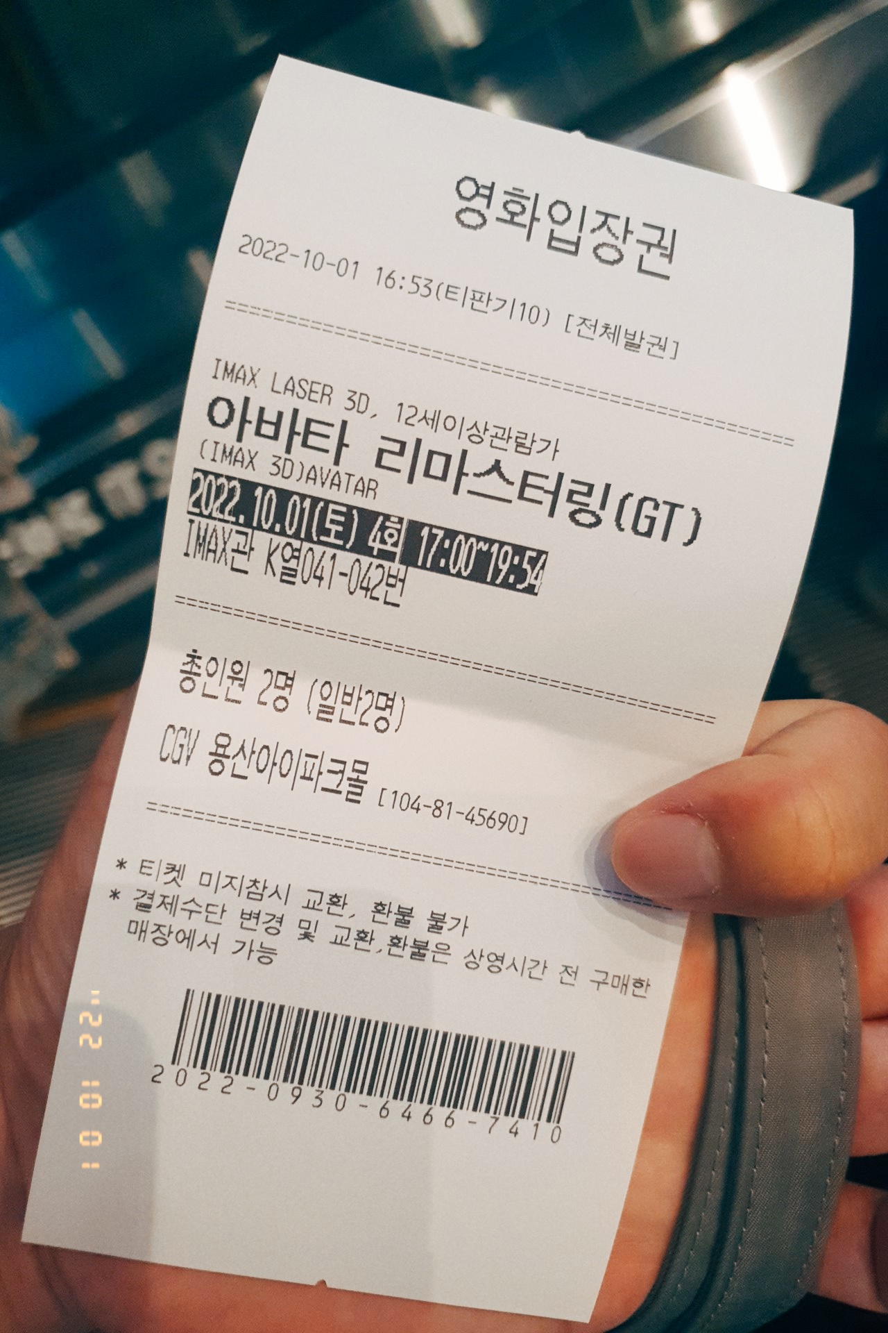 아바타(AVATAR) 라는 영화를 아시나요?.. 물어보기에는 이 영화는 너무 큰 흥행 영화이다. 아주 오래전 영화를 이 곳 용산 아이맥스에서 보았기에 2009년 이후 13년 만에 이곳을 다시 찾았다는 것이 여러 감정이 들었다. 어머니께 당시에도 생소한 IMAX 3D 영화를 보여드리고 싶어 함께 방문하였는데 이제는 와이프와 함께 이 영화를 다시 보러 왔다는 점. 13년만의 아바타라는 영화는 20대 중반의 나와 30대 후반의 나에게 다른 의미로 다가올까 라는 궁금증.. 깔끔하게 단장된 용산CGV 영화관은 9월 아바타 리마스터링과 12월 아바타의 신작 아바타 물의길에 대한 홍보 포스터로 도배되어 있었다. 와이프는 천만 영화인 아바타를 오늘 처음 본다고 한다. 하지만 큰 차이는 없다. 나는 13년 전에 보았지만..