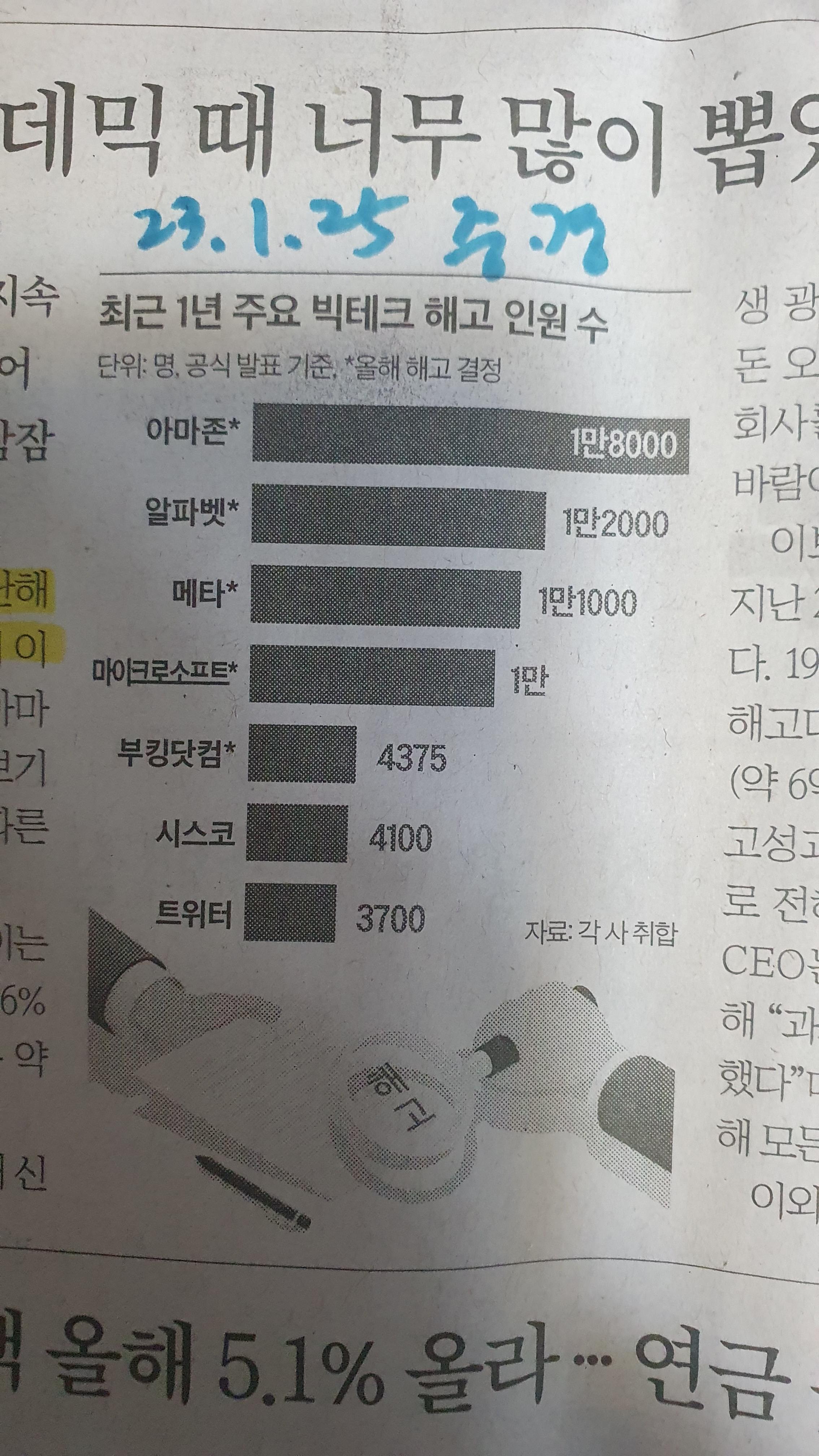 Comment)) 미국의 빅테크 회사의 해고 인원 수는 숫자만으로도 엄청나다. 코로나 시즌 고용과 함께 재택을 허가하며 많은 이익을 얻었지만 2023년 다시 겨울이 찾아오게 되었다. 한국에서도 게임사를 중심으로 IT 인력에 대한 구조조정이 조금씩 이루어지고 있기에 눈에 들어와 스크랩해본다. #최근 1년 주요 미국 빅테크 해고 인원 수 https://www.joongang.co.kr/ 중앙일보 중앙일보 - 뉴스 그 이상 The JoongAng. 정확한 뉴스와 깊이 있는 분석으로 세상을 전합니다. www.joongang.co.kr