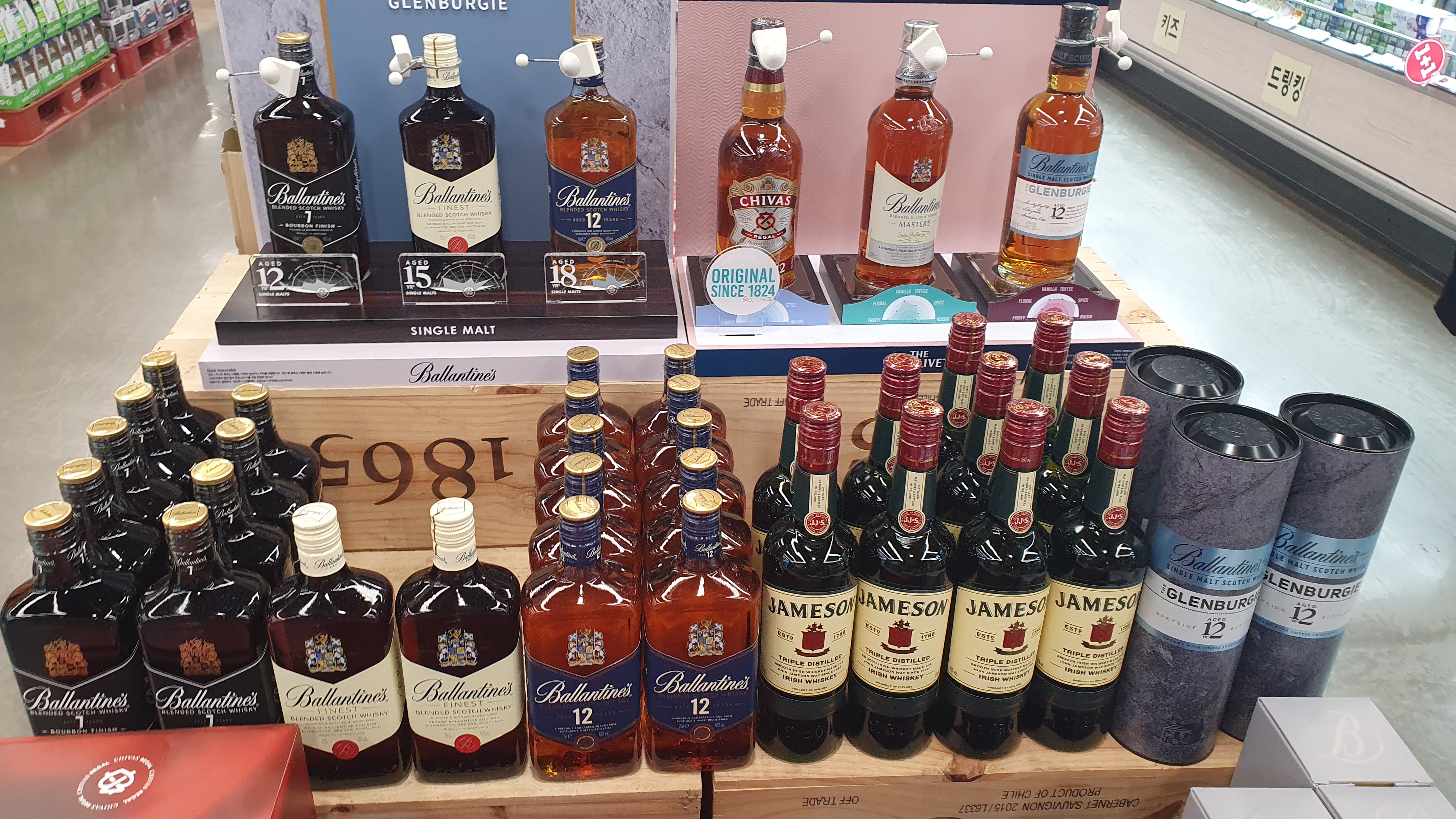 안녕하세요, 하코지코입니다. 롯데마트를 방문하니 5월 상반기 살짝 멈추었던 위스키 프로모션이 하반기 들어와서는 좀 더 활발히 진행 중입니다. 5월 하반기 들어서는 메이저 위스키 브랜드들의 적극적인 프로모가 눈에 띄네요. 롯데마트뿐만 아니라 이마트 홈플러스에서도 일부 품목은 공격적인 마케팅을 진행 중일이라는 것을 알 수 있었습니다. 방문 일시 : 2023년 5월 21일 / 영등포 양평동 롯데마트 1) 발렌타인 12년 싱글몰트 글렌버기 700ml : 79,800원 (할인가!) 밸런타인 홈페이지에서 표현하는 글렌버기의 키워드는 : 색상 꿀같은 황금색 / 향 감미로운 토피 애플의 달콤함 / 맛 부드럽고 풍부한 바닐라와 같은 과실향과 맛이 진하게 / 피니쉬 풍부하고 그윽한 2) 발렌타인 마스터즈 700ml : 5..
