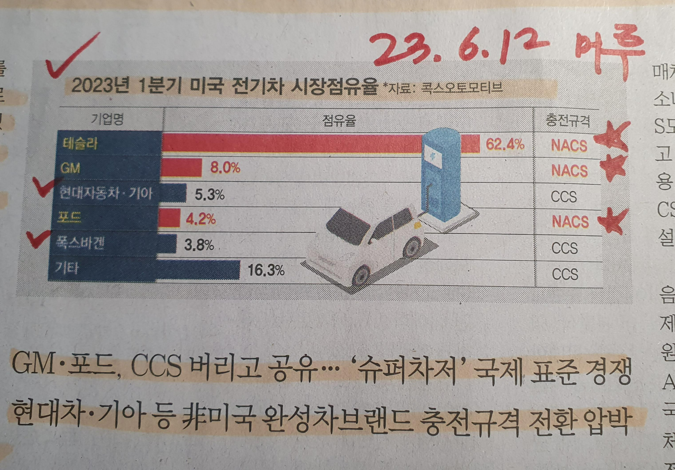 미국기업들 모두 전기차 충전규격 NACS 채택, 유럽 한국 자동차 회사들 난처.. 23.6.12 머투