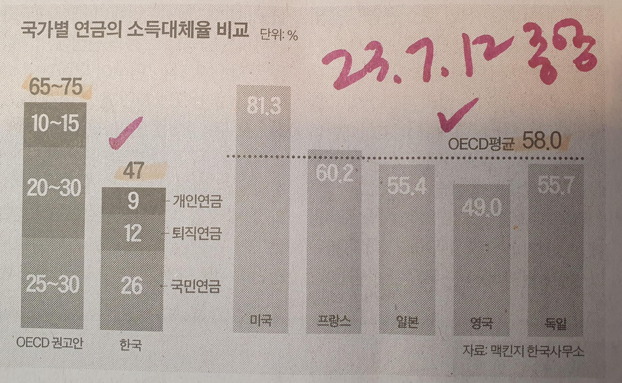 -노후가 되는 시점 기본적인 삶을 유지하는 것은 국민연금과 퇴직, 개인 연금이다. OECD 기준은 평균 58% -대한민국은 현재 47%로 낮은 수치인데 OECD의 권고안과 비교하면 국민연금은 평균치에 들어가지만 퇴직연금과 개인연금은 대한비율이 낮아 맞은 소득대체율을 보여주고 있다. -미국의 경우 81%, 프랑스 60%, 독일 55%, 일본 또한 55%로 노년층의 소득대체율이 평균치에 가까운 대체율이다. Comment)) 대한민국의 경우 국민연금은 지속적으로 월급에서 반강제적으로 납부하기에 안정적이지만 퇴직연금의 운용 및 개인연금의 준비는 인식이나 홍보가 높은편이 아니다. 미국의 경우에는 퇴직후 연금 운용이 미국 국가 ETF에 넣는 경우 지금까지 우상향 방향으로 수익이 늘어나 80프로 이상이라는 말도 안되..
