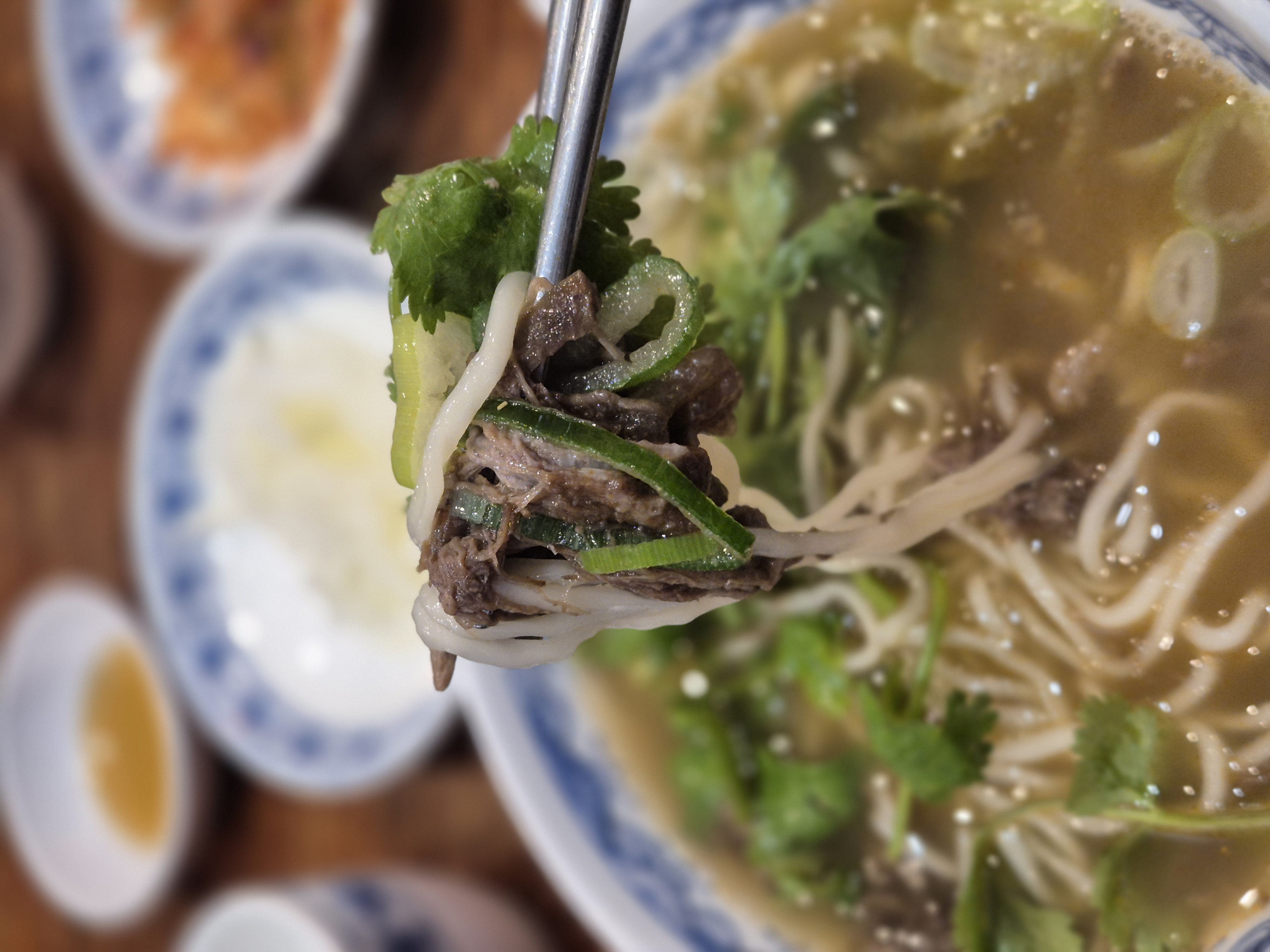 소고기 외에도 일부는 데친 청경채나 대파, 고수 등을 올리기도 하며, 고추기름이나 매운 장을 곁들이는 경우도 있습니다.