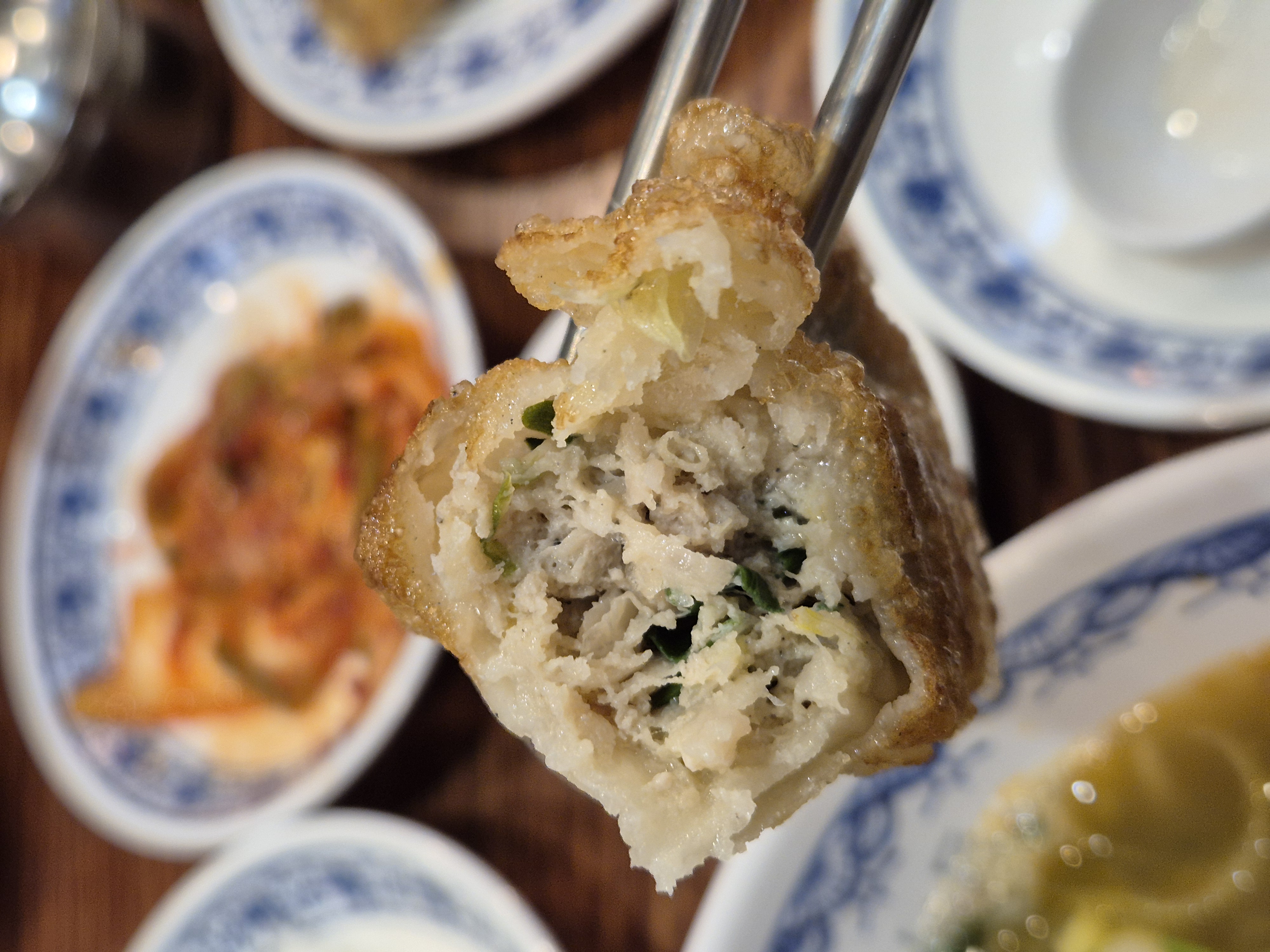 오한수 우육탕면의 군만두가 조금 딱딱하고 육즙을 가두어 두는 스타일이면,