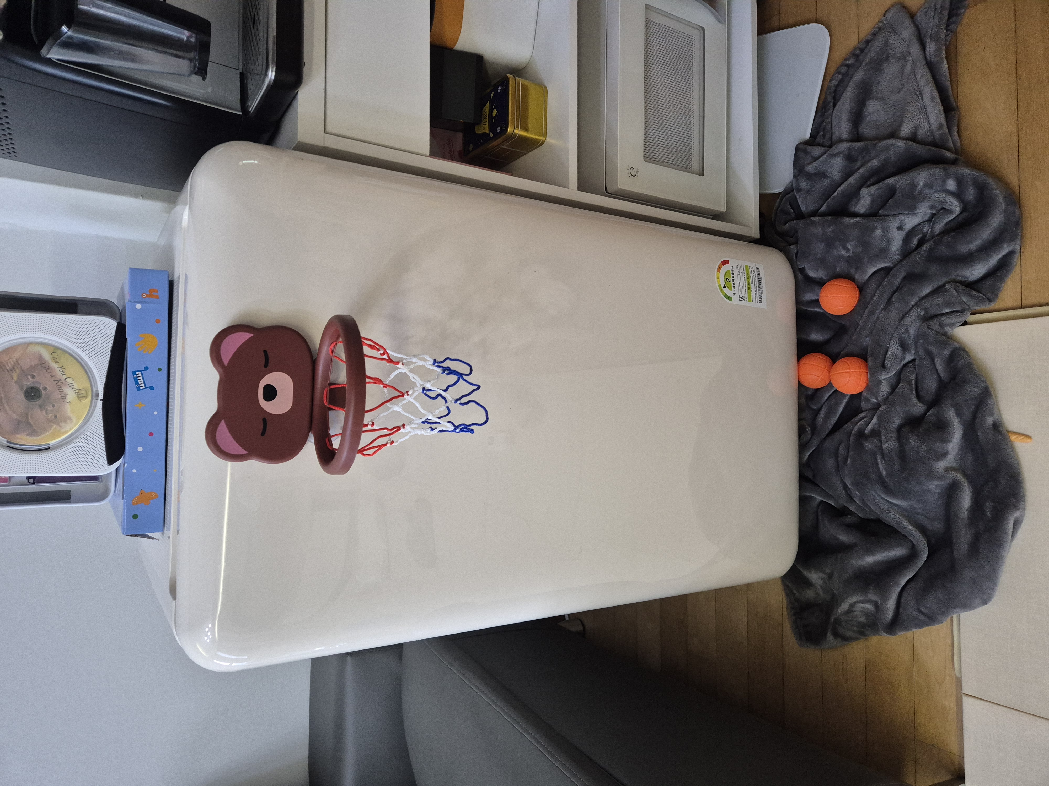 농구 골대를 구입하고 거치해 둘 곳이 마땅히 보이지 않아 집안 김치냉장고 위쪽에 설치하였다.