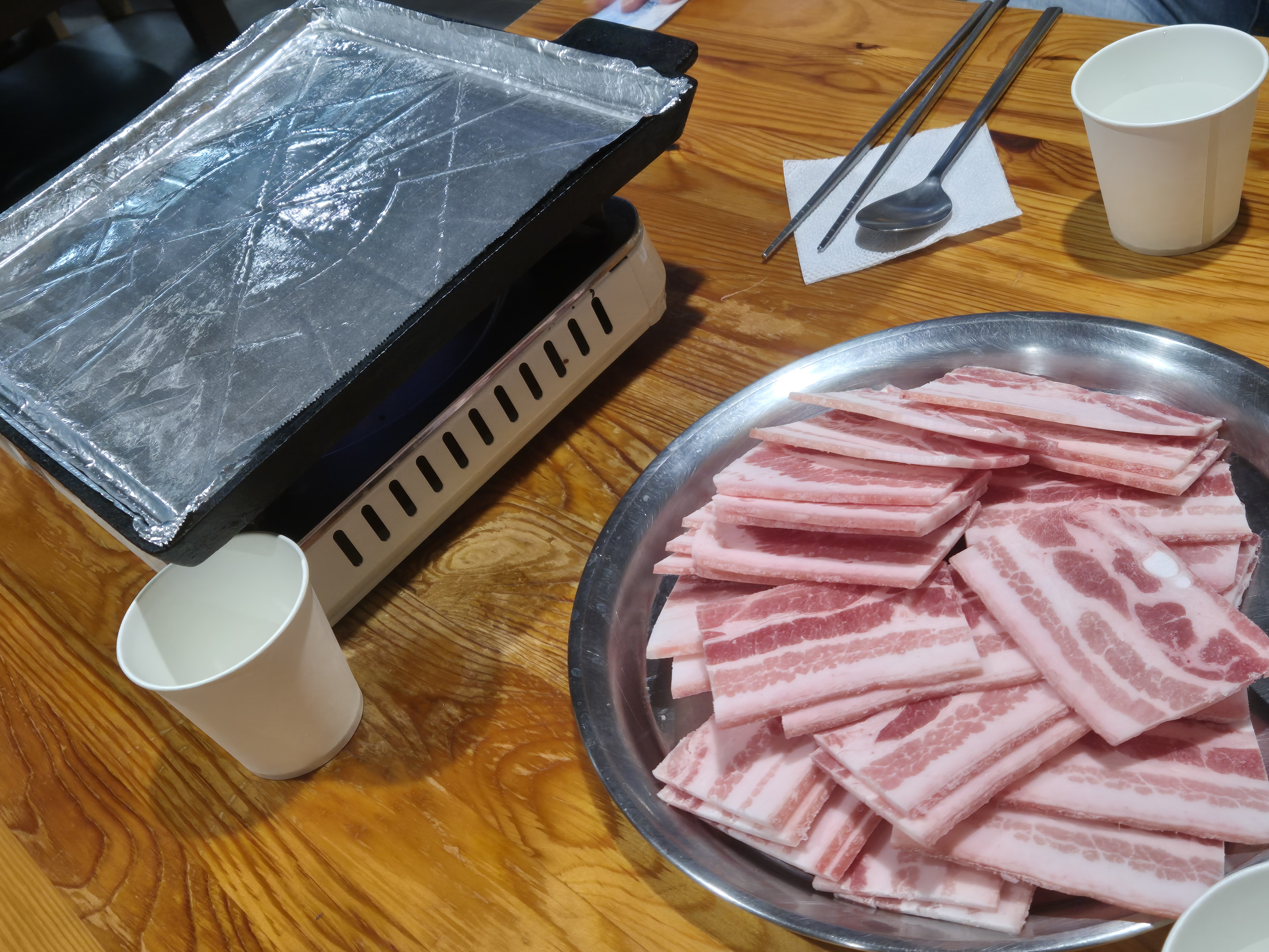 도란도란 술과 함께 냉동 삼겹살이 익혀진다.