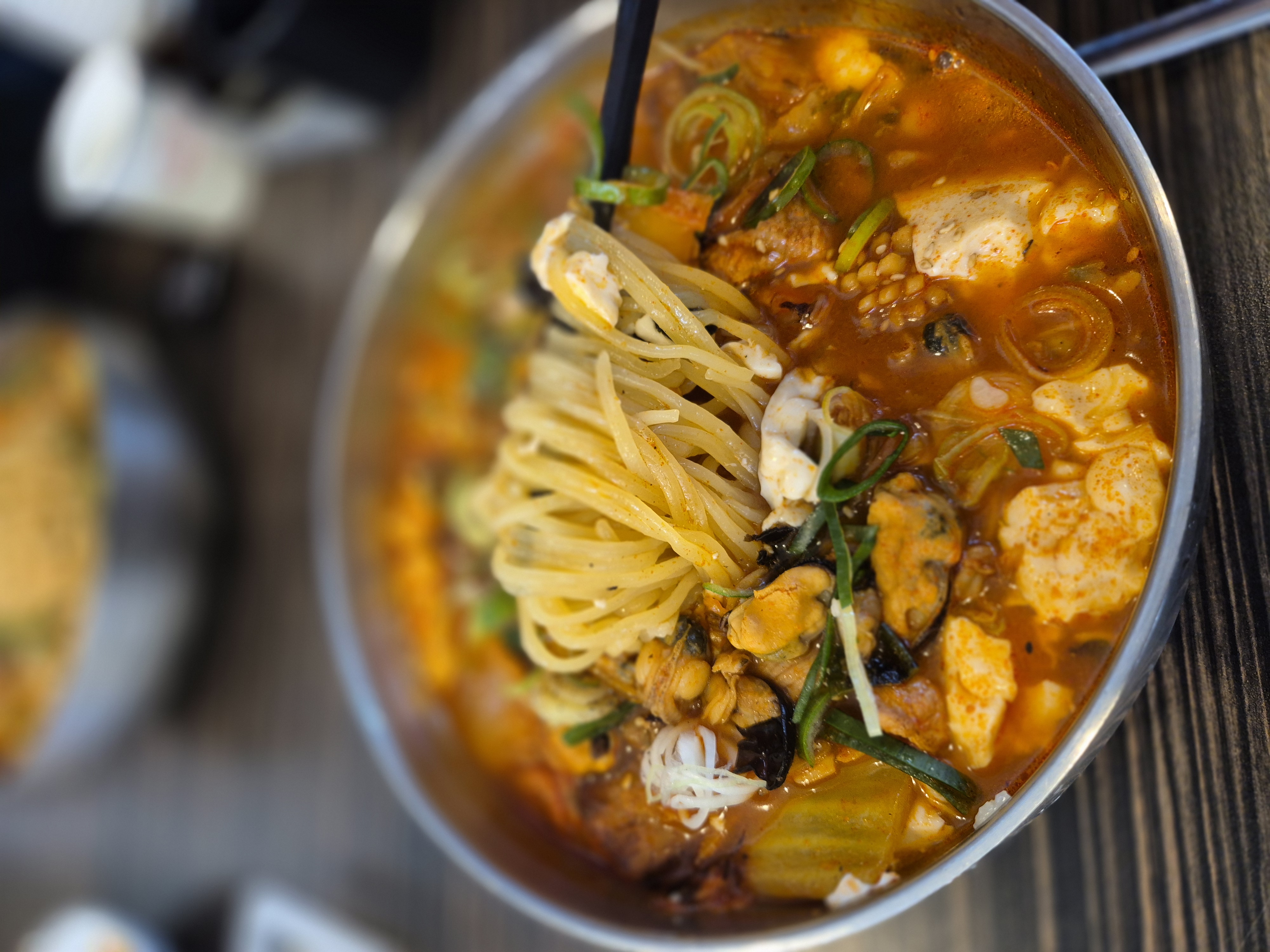 - 순두부의 부드러움과 홍합과 오징어 고기를 비롯하여 다양한 종합 고명이 포함되어 있어 면과 함께 먹는 재미를 준다.