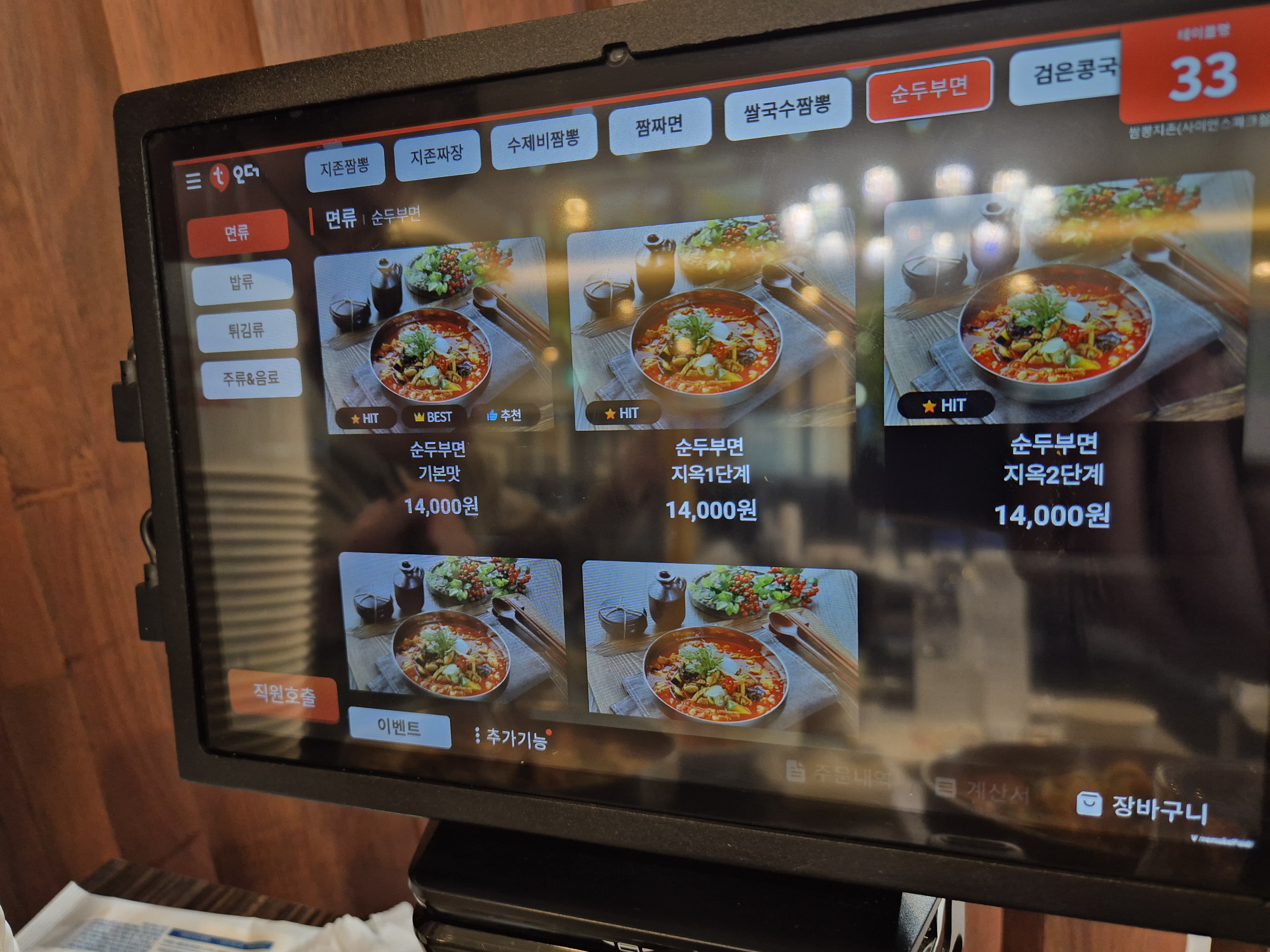 남자 셋이 방문하여 모두 순두부면을 주문하였다.