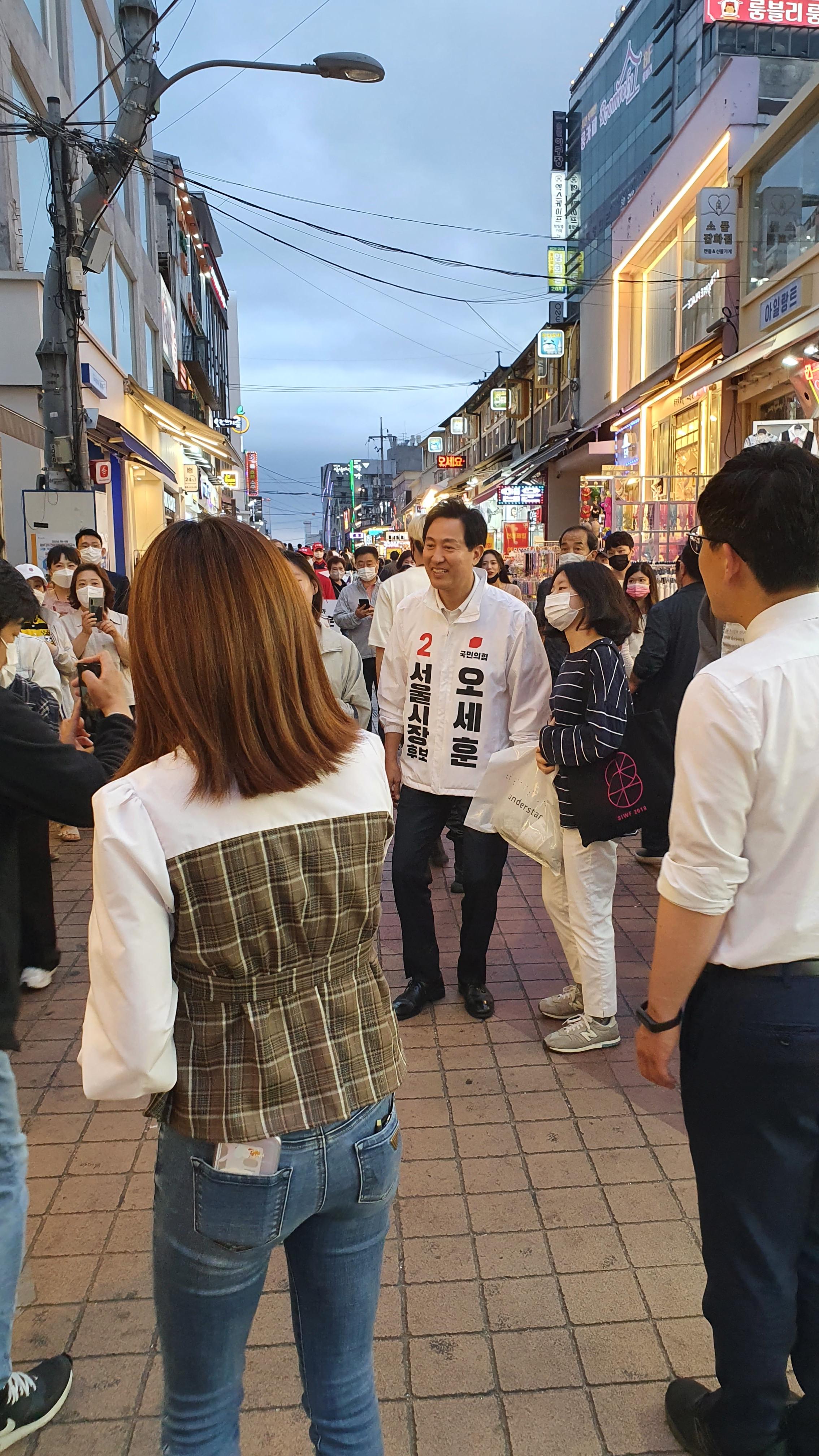 저녁마다 운동하러 가는 홍대길에 오세훈 후보를 만났다. 멀끔한 인상에 180cm 정도의 훤칠한 키가 눈에 띄인다. 선거가 막바지인지 얼굴이나 피부는 피로감이 눈에 띄인다. 하지만 사람들과 웃으며 사진을 찍기도 절대 찡그리는 모습없이 시민들과의 만남중이였다.