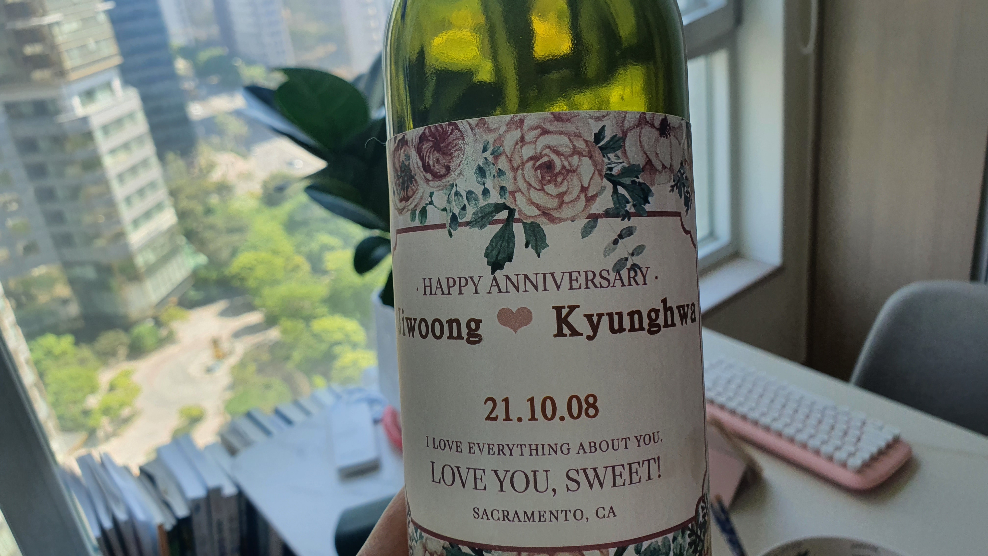 예상치 못헀지만 받는 입장에서는 고맙기도 미안하기도 평생 행복하게 잘해주야곘다 생각으로 눈물이 살짝(?)나는 감동스럼을 느꼈다. 사진의 와인병은 프로포즈일자가 적힌 라벨링 와인이였다. 같이 모두 마셨지만 버리기에는 의미가 있는 병이라 가지고 왔고 신혼집의 창가에 계속 모셔두고 있었던 와인병이였다.