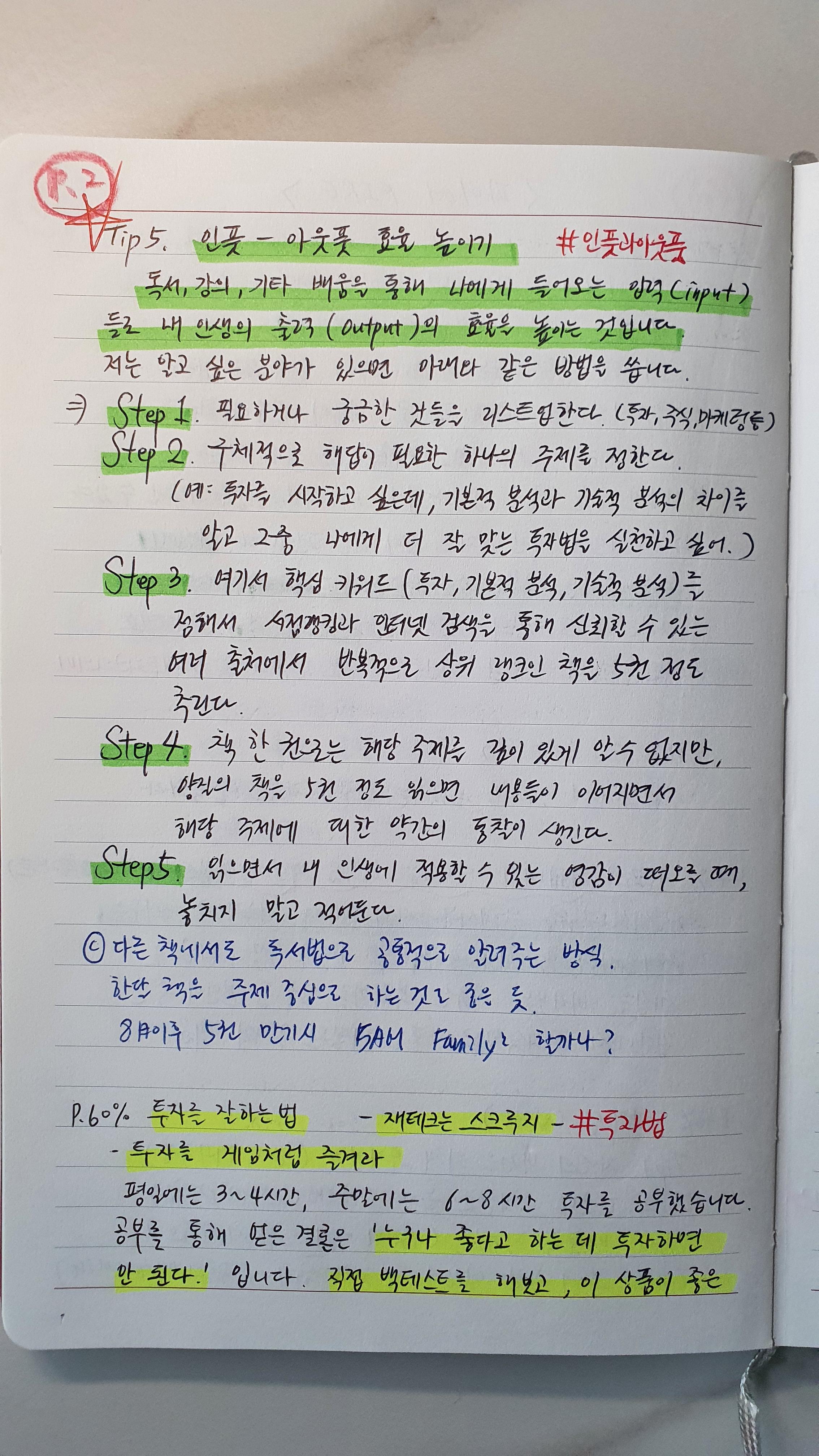 Tip 5. 인풋-아웃풋 효율 높이기 : 독서, 강의, 기타 배움을 통해 나에게 들어오는 입력input 들로 내 인생의 출력output의 효율을 높이는 것입니다. 저는 알고 싶은 분야가 있으면 아래와 같은 방법을 씁니다.