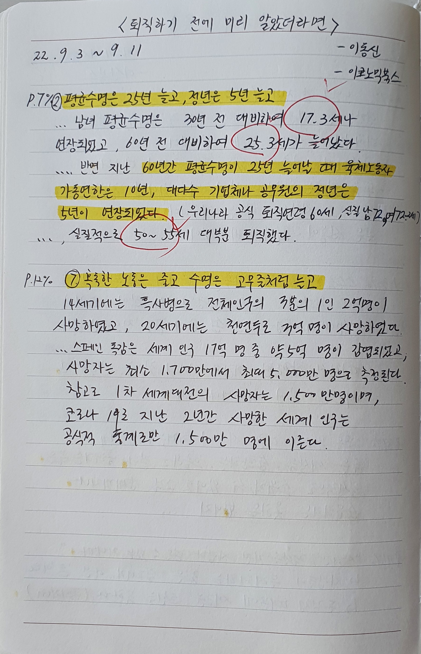 Hakojico Comment)) 교보 SAM 이북 순위권에 올라가 호기심에 읽은 퇴직 후 삶에 대한 책자. 읽다가 마음에 와닿은 문구를 적었다. 우리의 삶은 30년 전에 비하여 25년이 늘었지만 정년은 5년이 길어졌다. 하지만 공무원이 아닌 일반 사기업의 경우 50대가 넘어가면서 어느 순간 실직을 하더라도 이상하지 않은 세상이다. 우리의 길어진 수명만큼 우리의 퇴직 후 삶은 어떻게 살아할지 궁금한 사람이라면 읽어보기를 추천한다.