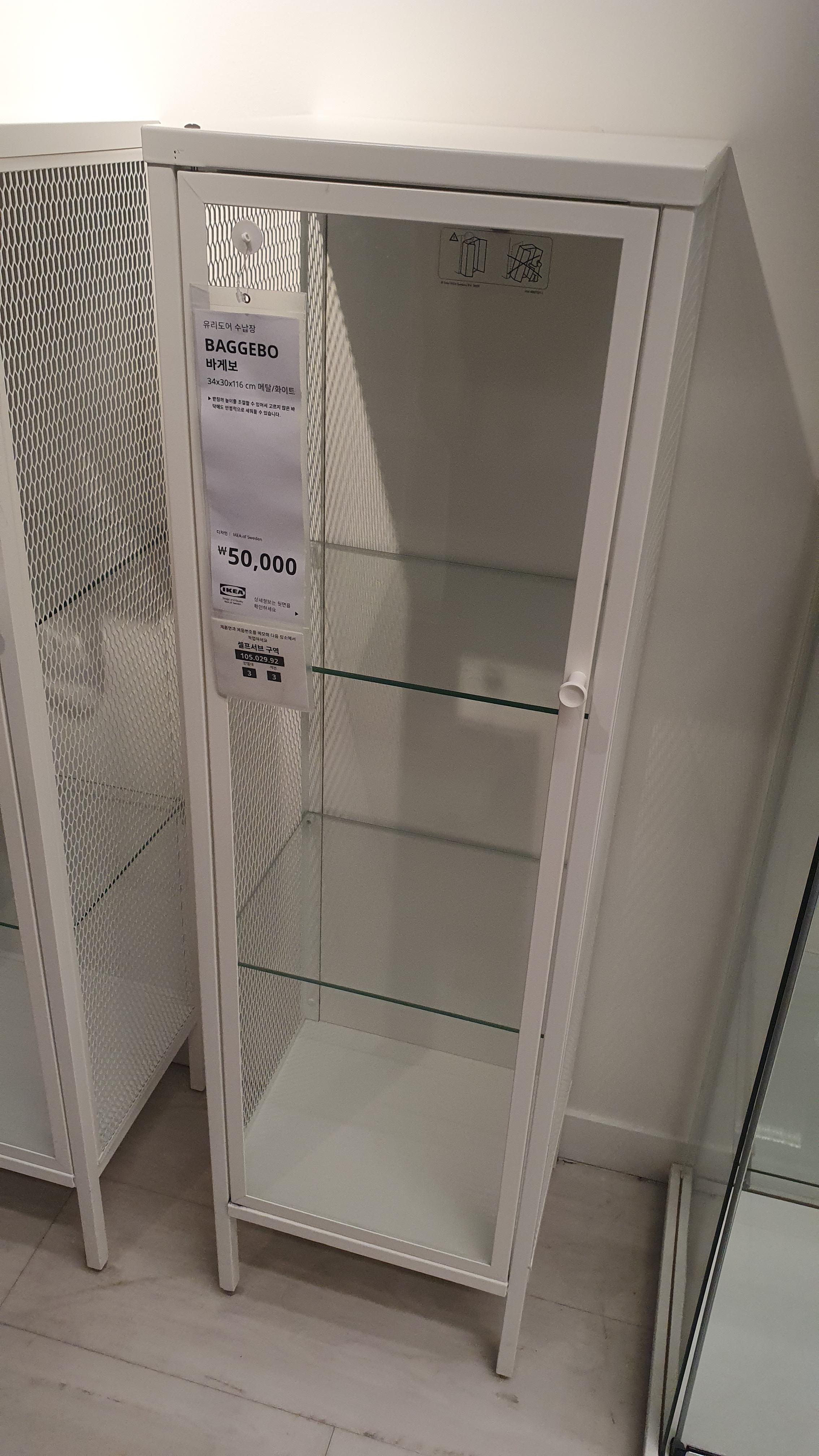 다른 장식장 이케아 제품과 비교하면, 3단으로 구성되어 보통 4단 구성된 다른 제품 대비 사이즈가 작은 사이즈. 통유리가 아닌 양옆은 오픈형 철제로 구성되어 있다. 10만원이 넘는 고급형 제품보다 차라리 5만원대의 바게보 제품이 가성비가 좋아보였다.