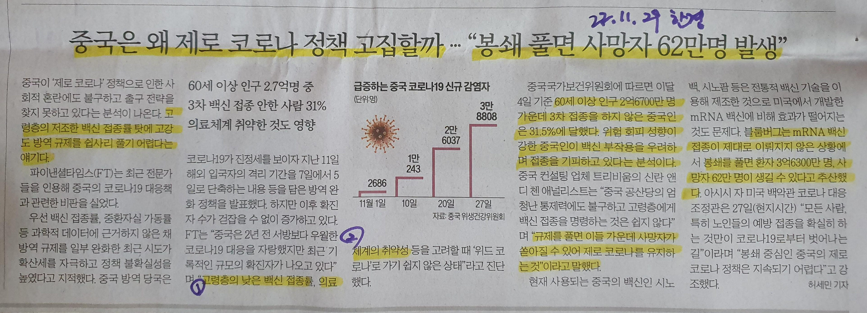 중국의 제로코로나 정책은, 14억이 넘 인구수를 가진 국가에서 이루어 질 수 없는 결국 이제 봉쇄를 풀면 사망자 62만명까지 생각하는 상황으로 맞닫게 되었다고 생각되었다. 무역업에 종사하는 입장에서 결국 대한민국 또한 이러한 중국의 상황에 영향을 크게 받아 씁쓸한 느낌이다.