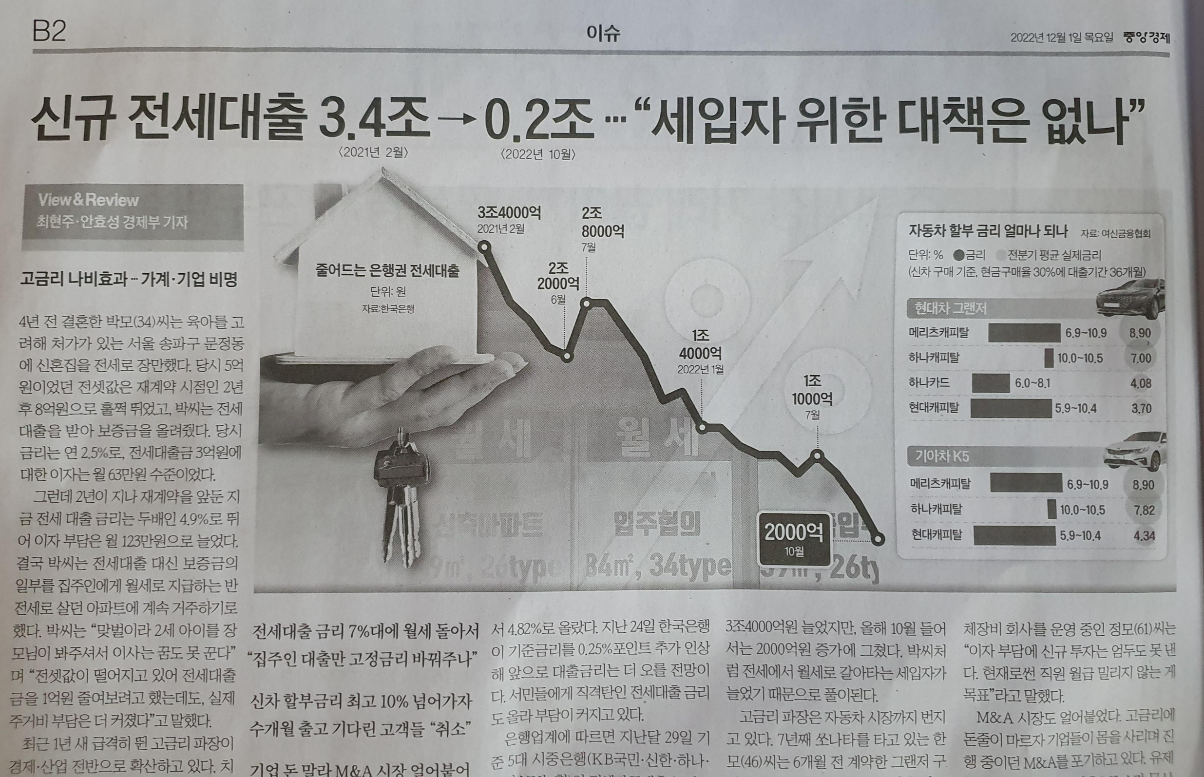 신규 전세대출 3.4조-> 0.2조, 자동차 할부 금리 인상 /중앙경제 22.12.1