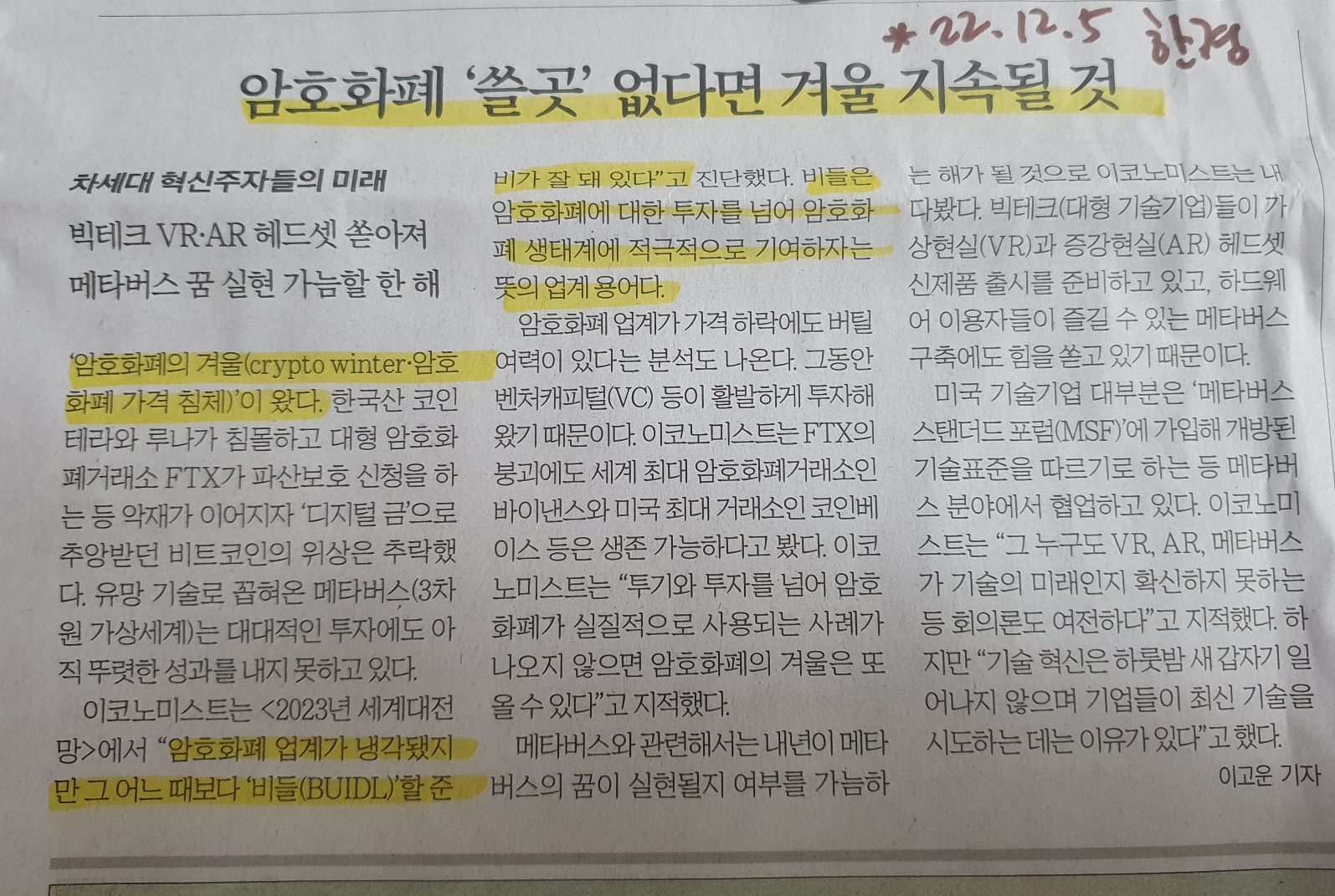 암호화폐 사용처가 없다면 냉각기 상황 지속될 듯 22.12.5 한경