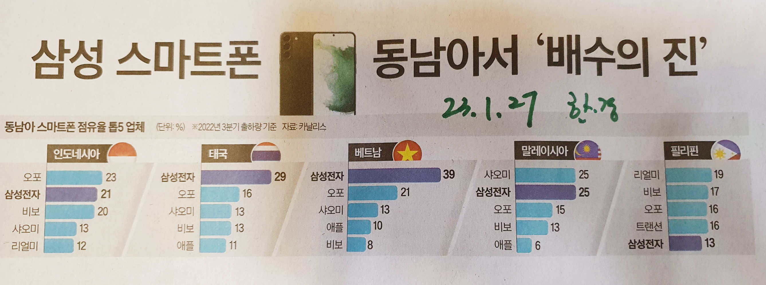 삼성 스마트폰 동남아 점유율 리스트 23.1.17 한경